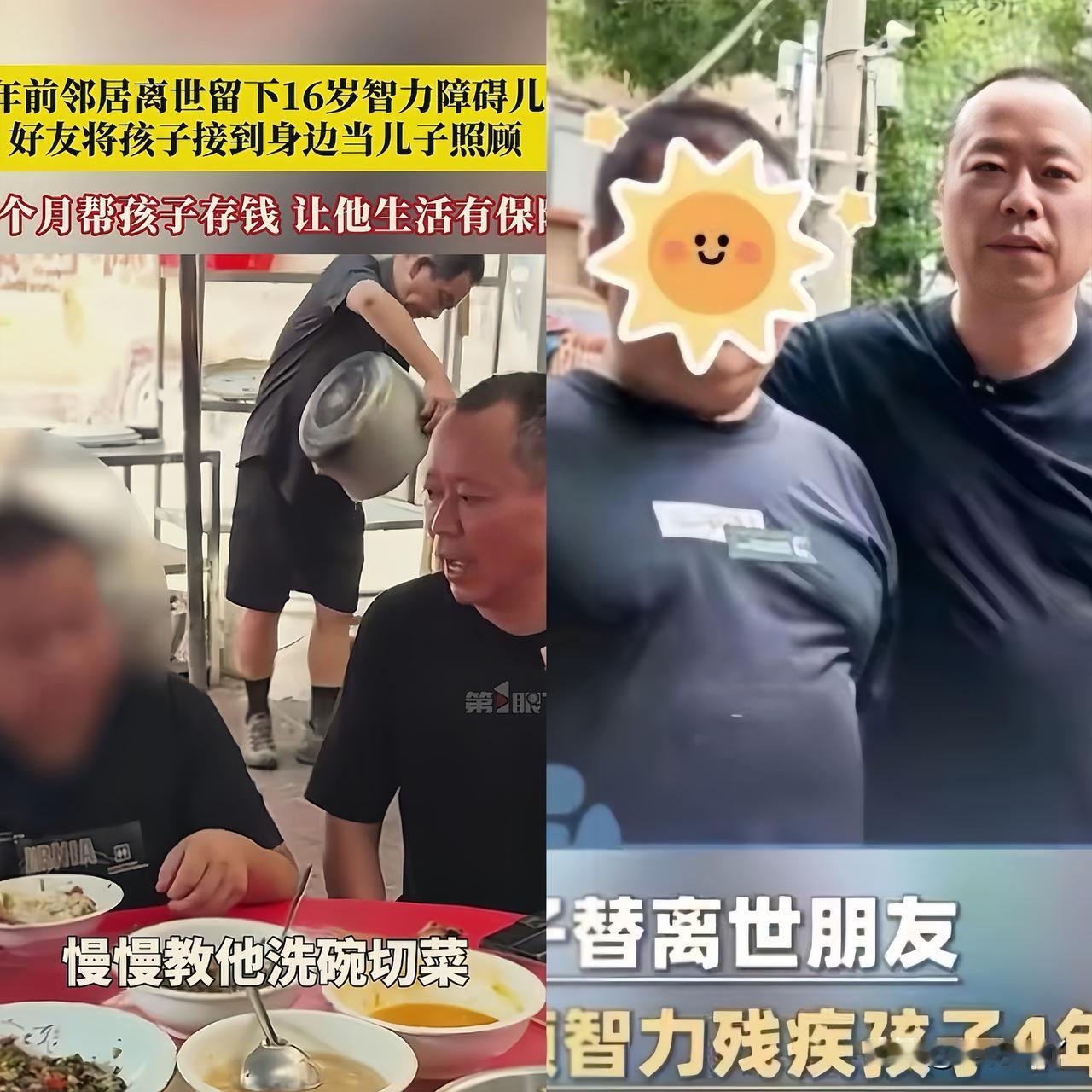 一句承诺、五年守护, 这不是血缘,而是超越血缘的"人间大爱"。他用自己的坚守,照亮了一个孩子的人生,也温暖了整个世界。 “你放心走,孩子我来管!”5年前,湖南湘潭的杨先生攥着挚友的手,在病床前许下这句承诺。彼时挚友52岁,生命走到尽头,最放不下的,是16岁却只有四五岁心智的儿子小熊。 挚友离世后,杨先生没犹豫,直接把小熊接回了家。刚进门的小熊怯生生的,躲在角落不说话,连自己穿衣洗漱都要人教。杨先生和妻子没嫌麻烦,每天陪小熊聊天、玩简单的游戏,吃饭时耐心教他用筷子,睡前给他讲小故事,慢慢焐热了孩子封闭的心。 光照顾生活还不够,杨先生想着“得让孩子自力,以后能自己在社会上站住脚”。他把小熊带到自家餐馆,从擦桌子、洗碗开始教,切菜怕他伤手,就握着他的手一点点找感觉,端菜时反复叮嘱“慢慢走,别慌”。一次学不会就教十次,哪怕小熊偶尔出错,他也从不说重话,只笑着鼓励“下次咱就做好了”。 如今5年过去,曾经怯弱的小熊像变了个人。不仅能把自己打理得干干净净,还能熟练地给客人端菜、煮面条,见人来了会主动露出笑容打招呼。杨先生不仅暖心还想得十分长远,每个月都悄悄给小熊存一笔钱,加上孩子的低保,他总说:“多攒点,以后我不在了,孩子也能好好过日子。” 都说“承诺易许,坚守难”,可杨先生用5年的朝夕陪伴,把一句临终嘱托,活成了对兄弟最厚重的交代。这份无关血缘的守护,比任何轰轰烈烈的故事都动人,必须为他狠狠点个赞! 你是否也被这人间温暖狠狠的戳中内心?