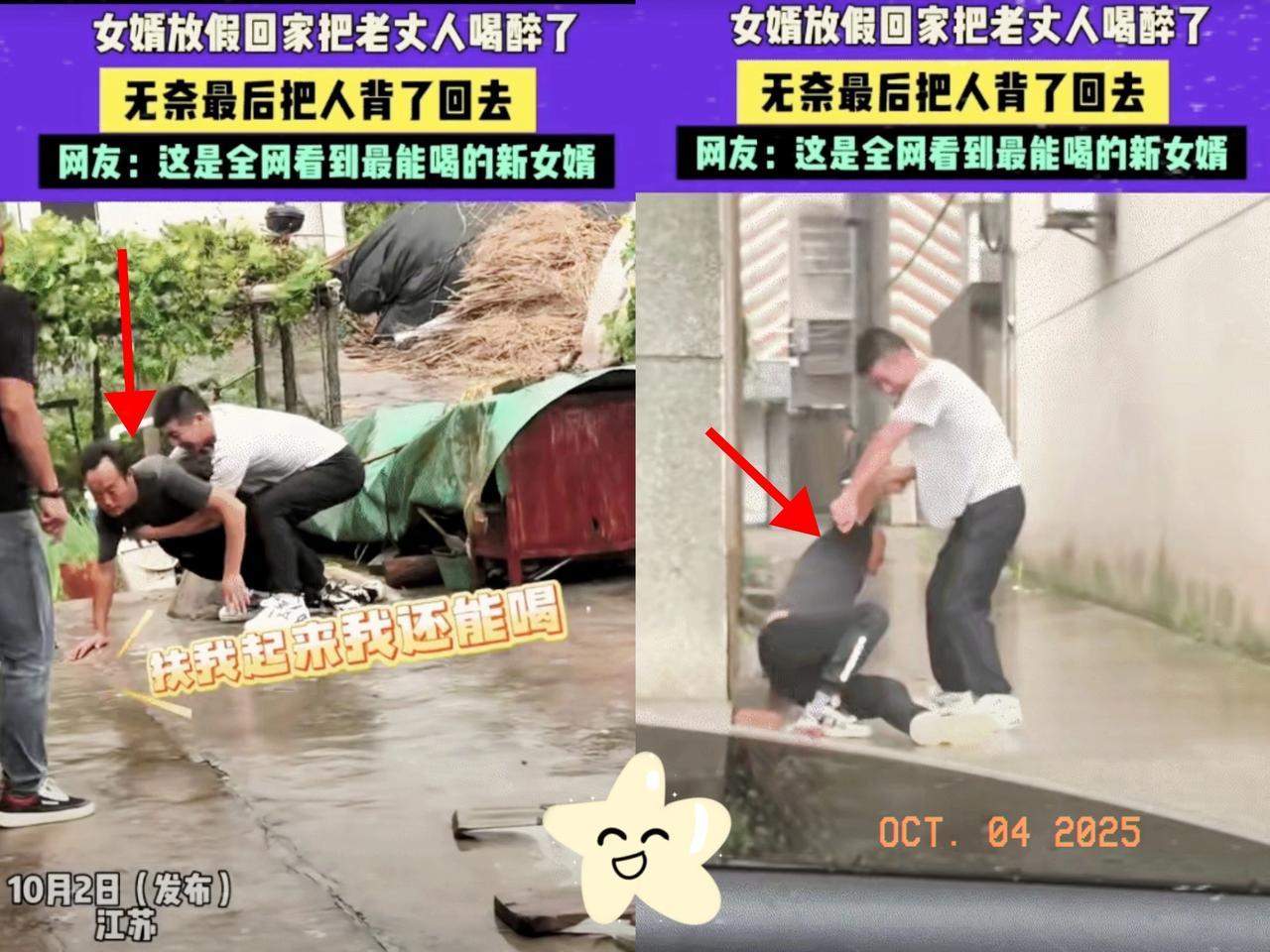 笑不活了! 江苏女婿陪媳妇回娘家, 居然把老丈人喝趴下了, 下雨天刮着风,老丈人走路直打晃,一下栽地上,女婿赶紧扶,没走两步又倒了,最后只能背着老丈人往家挪。 评论区直接炸了锅,有人说自己当年一挑三,把老丈人、大舅哥、大姐夫全喝睡了;也有人说老公去娘家被老丈人干趴,全桌就老丈人清醒。 其实啊,陪老丈人喝酒哪是拼酒量?是拼心意!酒量再好也得让着点,老丈人好面子,点到为止最体面。 不过我觉得这喝酒还得适量,哪怕酒量再好,也不要贪杯,毕竟喝醉了,难受不说,还伤身体,像是在假期时,这种亲人团聚时刻,喝酒的话,喝上两杯就可以了。请老丈人喝酒