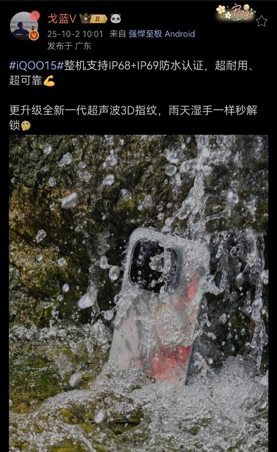 iQOO 15 支持 IP69 和 IP68 防尘防水,超声波指纹识别也有升级。