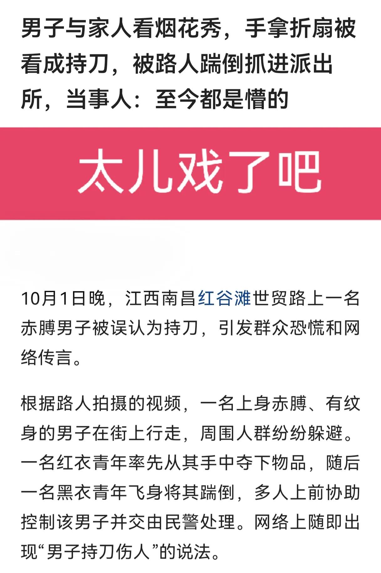 太儿戏了吧!那么多人一个眼神好使的没有吗?即使持刀没有伤人的情况下,普通民众可以对对方实施攻击行为吗?将人打倒还不能看出是扇子吗?为什么还要被带到里面去审问,这操作太迷幻了! 男子拿扇子被误认持刀 遭踹倒送警局