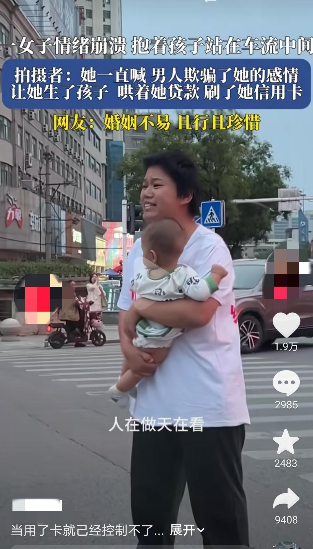 一女子,抱着孩子站在车流中的她, 喊出了多少女人的委屈… 刷到这个视频时,心瞬间揪紧了。一个女人抱着孩子站在车水马龙中间,崩溃哭喊着男人骗了感情、哄她贷款刷信用卡——这场景里藏着的,是无数被感情和现实双重碾压的绝望。 谁也不知道她经历了多少个失眠的夜晚,才会把最后的尊严扔在马路中央。那个男人用“感情”当诱饵,让她生下孩子,又让她背上债务,最后拍拍屁股消失,把烂摊子全留给她。而她怀里的孩子,本该是爱情的结晶,如今却成了她崩溃时刻唯一的“牵绊”和“证据”。 网友说“婚姻不易且行且珍惜”,可这根本不是婚姻的问题,是遇到了烂人的问题。更让人揪心的是,现实里还有多少姑娘,正被类似的套路套牢?有人用甜言蜜语骗走青春,有人用“未来承诺”骗光积蓄,最后都落得像她这样,抱着孩子在风雨里茫然无措。 但她站在车流里的样子,也该让所有姑娘看清:感情里一旦掺杂了“哄骗式负债”,就得立刻清醒。别等到被拖垮了人生,才想起要为自己和孩子兜底。