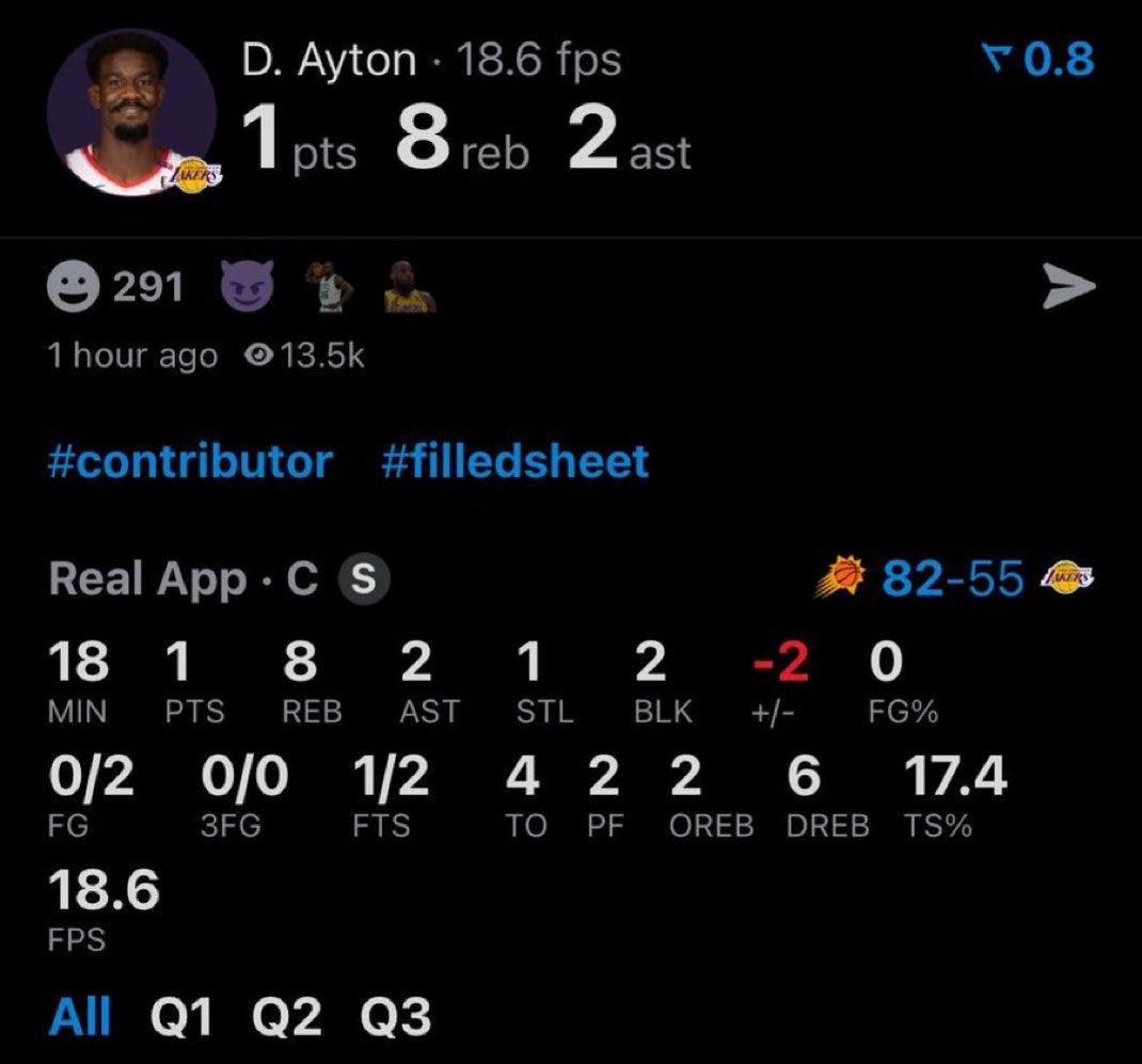 到底是救世主还是替罪羊? 艾顿在赛后的采访中回答说:这不重要,我不是为数据而来的,我想向球队展示我的防守端的重要性。 顿宝在湖人的季前赛首秀,砍下1分8篮板2助攻。 本场比赛,东契奇、詹姆斯都未上场,里弗斯主要在进攻,缺少有人“喂饼”。 希望这个理由很充分,毕竟是第一场,毕竟是状元,每个人都有自己的适应期。