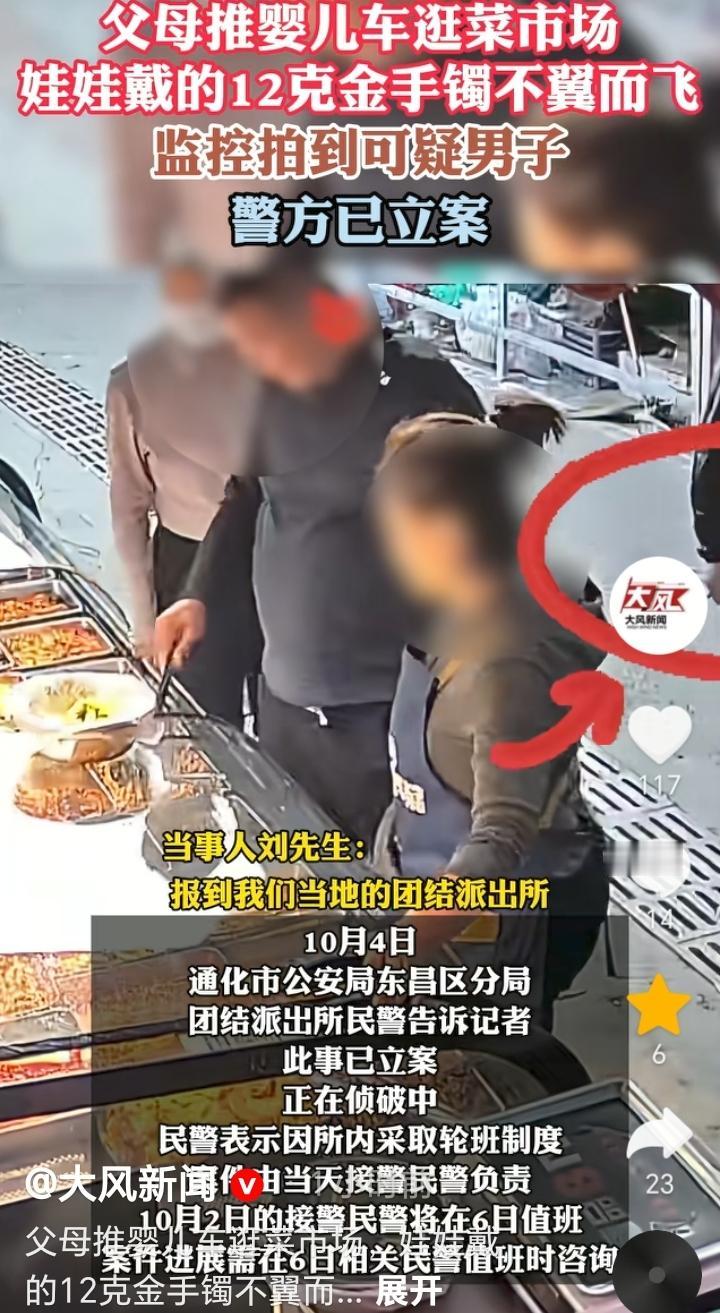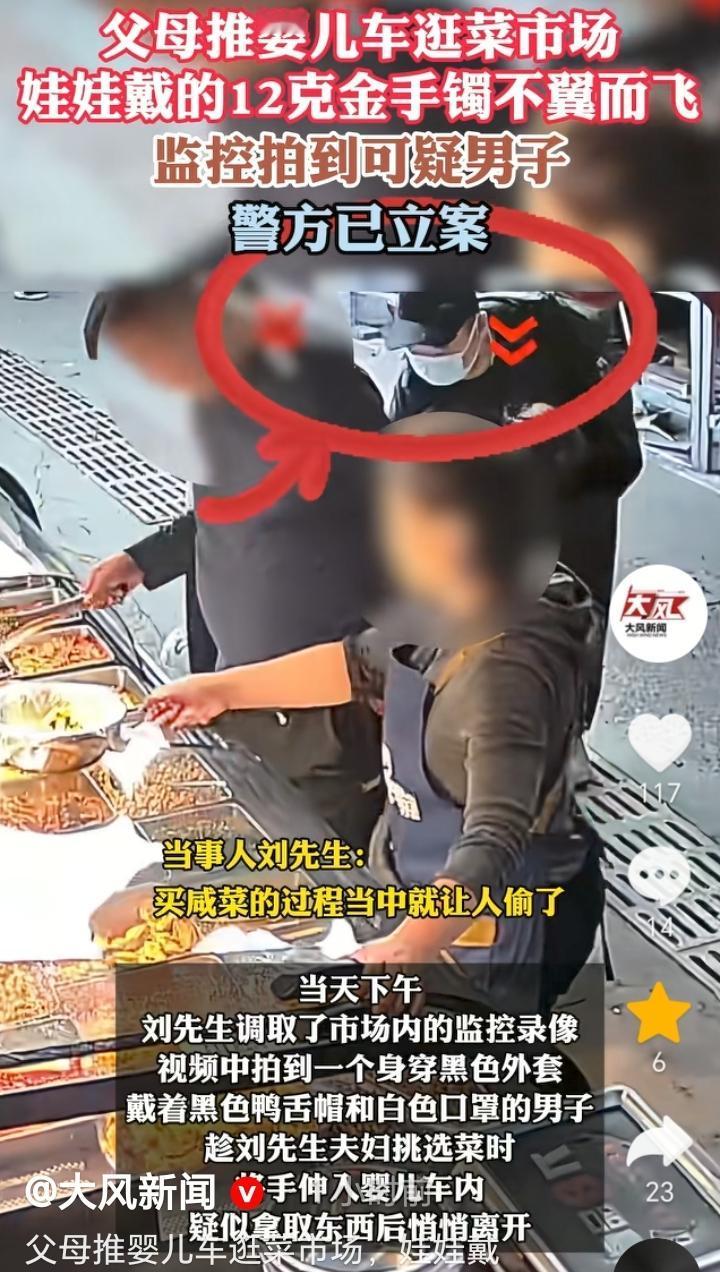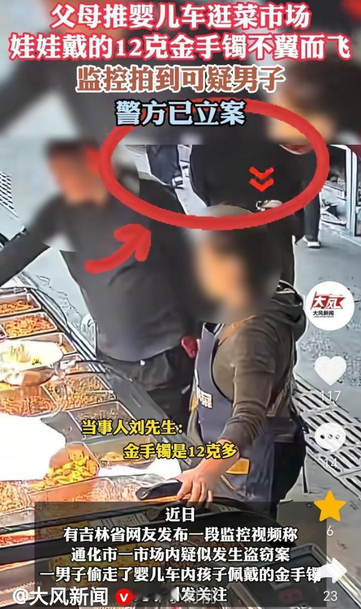 侥幸心理!吉林通化,夫妻俩推婴儿车逛菜市场,结果准备离开时发现婴儿车里孩子带的12克金手镯不见了。 据大风新闻报道,近日吉林通化的刘先生表示,他和妻子推着婴儿车在一个咸菜摊前停留,离开时发现婴儿车里孩子戴的12克金手镯不见了,大概价值在13000元左右,查看监控后发现一位身穿黑色外套,戴黑色鸭舌帽和白色口罩的男子,趁着刘先生夫妻挑选菜时将手伸进婴儿车内,疑似拿取东西后悄悄离开,目前警方已经立案。 这男子不仅胆大而且心理素质也是很强,菜市场人来人往,父母就在旁边就敢直接手伸进婴儿车偷东西,都没有担心当场被发现。 看他那一身打扮,黑色外套,鸭舌帽口罩,很有可能就是有备而来,就是准备在菜市场人流量大的地方下手偷东西。 男子这行为就是典型的抱着侥幸心理,他以为“全副武装”起来别人就发现不了他是谁,殊不知现在到处都是监控覆盖,他的行踪很容易就会被锁定,最后等待他的会是法律的制裁。 千万不要抱着侥幸心理去做坏事,天网恢恢疏而不漏,没伸手,伸手必被抓。