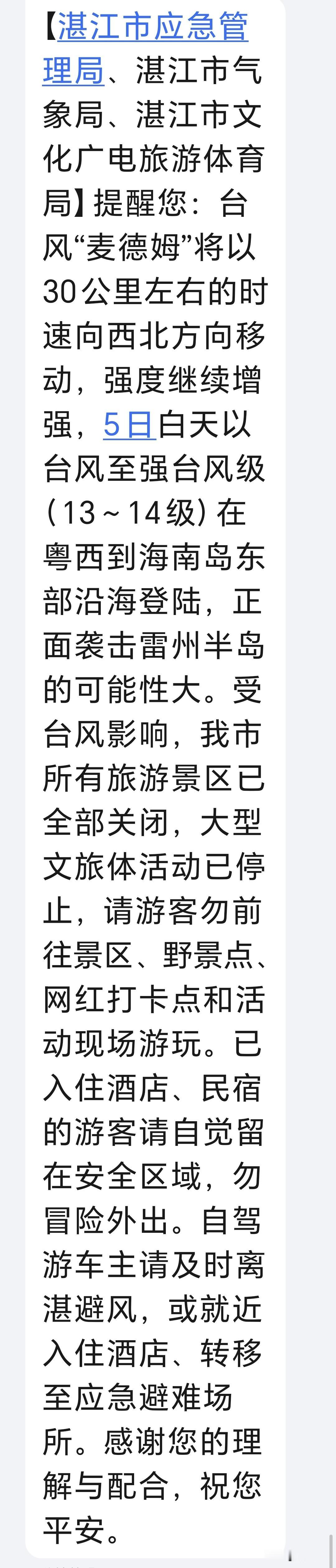 来者不善,善者不来。麦德姆来势汹汹,湛江市区台风橙色预警信号生效,湛江市民千万不要掉以轻心。由于之前两次台风对湛江的影响都不大,可能让湛江市民对这个麦德姆台风不太重视。但是台风的运动变化多端,强度也不断变化,必须时刻关注气象台消息,加强台风防御措施。过去的经验表明,越是开始不引起重视的台风,后来造成的影响越严重!希望这一次是例外。
