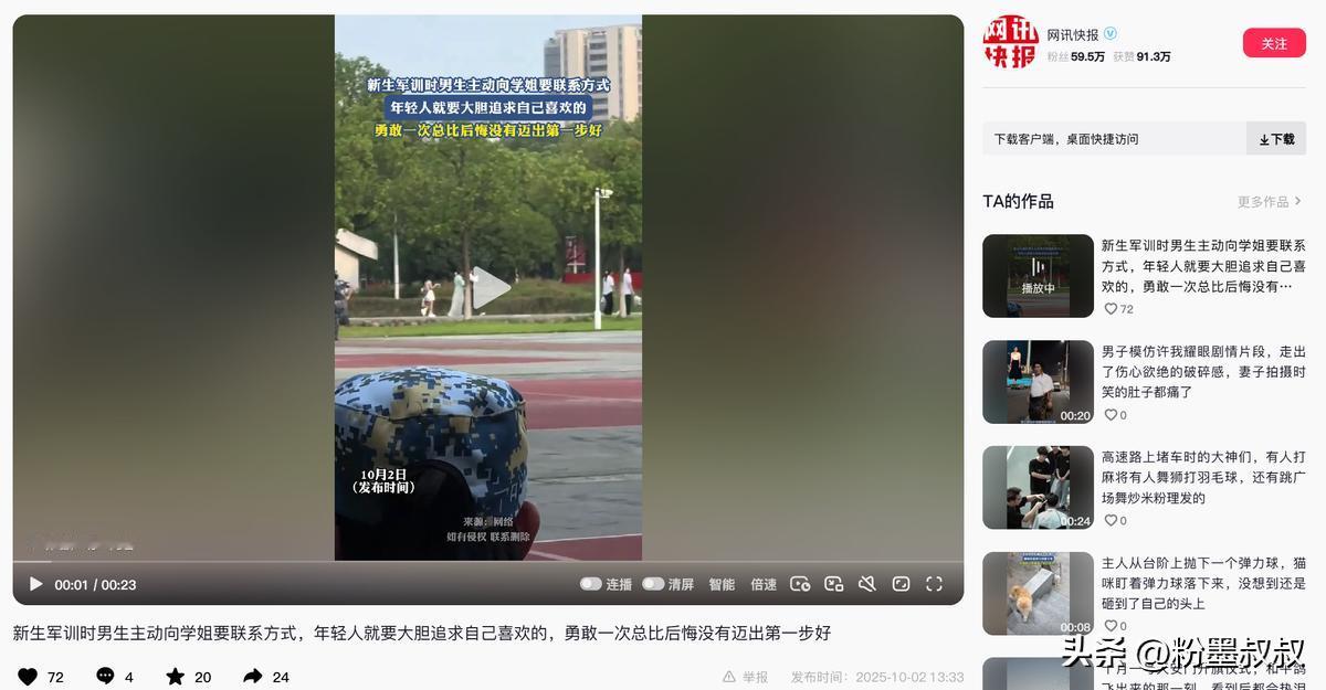 高端的猎人往往以猎物的方式出现!一名男生在军训休息间隙,发现一名漂亮学姐,瞬间就动心了,竟然直接追上去,问学姐要微信,连队的学生都为男生的勇敢欢呼,学姐愣了一下,笑着同意了!男生随后兴奋的跑回来,嘴角连AK都压不住了!网友:男生甚至保持了第一次见面的距离! 九月的太阳是真毒,操场边上的香樟树叶子都晒得打卷,我们这些大一新生坐在地上休息,汗还是顺着额角往下滴,迷彩服的袖子挽到胳膊肘,手里的矿泉水瓶都被攥得变了形,大家要么靠在树边闭目养神,要么凑在一起小声唠嗑,没人想多动一下,刚练完队列腿早就酸得不行。 突然有人戳我胳膊,我迷迷糊糊睁开眼,顺着他指的方向看过去,操场另一头有个穿白裙子的学姐,手里拿着个浅蓝色文件夹,走得慢悠悠的,好像一点都不怕热。 阳光落在她头发上,发梢泛着点浅金色,风一吹裙摆轻轻晃了晃,跟我们这一群灰头土脸的新生比起来,看着特干净、特清爽。 我旁边那男生,叫啥我还没记住,刚才还蔫蔫的靠在树上,看见学姐立马坐直了,手攥着水壶紧了紧,耳朵都有点红。 他室友在旁边起哄:“哎,要不要去要微信啊?再不冲,人学姐就走过去了!” 他没说话,眼睛就盯着学姐的方向,顿了两秒,突然 “噌” 地一下站起来,跟离弦的箭似的往那边冲,我们这一圈人都没反应过来全愣住了。 本来以为他会直接跑过去凑到学姐跟前,没想到快到学姐跟前的时候,他居然放慢了脚步,一步一步走得稳了些,最后停在离学姐大概一米远的地方,没再往前靠。 我离得不算近,但能看见他手在口袋里摸手机,摸了半天没摸出来,后来他自己说,当时手紧张得都在抖,手机在口袋里滑来滑去抓不住。 学姐一开始也愣了一下,停下脚步眼睛眨了眨,我老远都能看见她眼角悄悄弯了,估计是在憋笑,没好意思笑出声,就安安静静地看着那男生,等着他说话。 男生咽了下口水,声音有点发紧,但还算清楚:“学姐,能、能加个微信吗?” 学姐听完点点头,拿出手机解开锁,手指轻轻敲了敲手机壳,扫码的时候,眼睛弯成了月牙,还轻声说了句 “军训加油啊”。 我们这边本来都静悄悄的,所有人的目光都跟着那男生走,学姐一同意加微信,立马炸开了锅,口哨声、欢呼声全来了,有人还拍着大腿喊 “牛啊!” 他室友直接冲上去,拍着他的肩膀使劲晃,连教官都靠在操场边的栏杆上笑,没说他 “纪律松散”,就只是摇了摇头,眼里也带着点笑意。 那男生加完微信,跟学姐说了声 “谢谢”,转身往回跑的时候,嘴角都快咧到耳朵根了,跑起来步子都比平时轻快。坐回我们这边的时候,他还在反复摸手机,点开好友列表看了又看,我们逗他:“刚才手抖得跟筛子似的,现在不抖了?” 他也不反驳就嘿嘿笑,那开心劲儿藏都藏不住,后来网上有人剪了这段视频,配文说 “这嘴角连 AK 都压不住”,真的太形象了,不是那种夸张的大笑,就是从心里冒出来的高兴,怎么都绷不住。 这段视频发到网上后,评论区也热闹得不行,一开始好多人说 “还是年轻好啊,有勇气,换我当年肯定不敢”,还有人回忆自己军训时没敢说出口的遗憾。后来有人注意到细节,说 “这男生懂分寸啊,没直接凑到学姐跟前,保持了一米距离,看着就舒服不冒犯”。 再往后,更多人开始说学姐:“你们看学姐那反应,一开始愣一下其实是在憋笑吧?一点都不尴尬,还主动说‘军训加油’,既给了男生台阶又不让场面冷下来,这才是高端的猎人啊,看着像被动的‘猎物’,其实把节奏拿捏得死死的,比那种冷冰冰拒绝或者敷衍的强太多了。” 其实现在想想,军训那阵子累是真累,但这种突然冒出来的小插曲,才特别像青春该有的样子,有点莽撞的勇气,恰到好处的分寸,还有温柔的回应。 (信息来源:网讯快报2025-10-2)