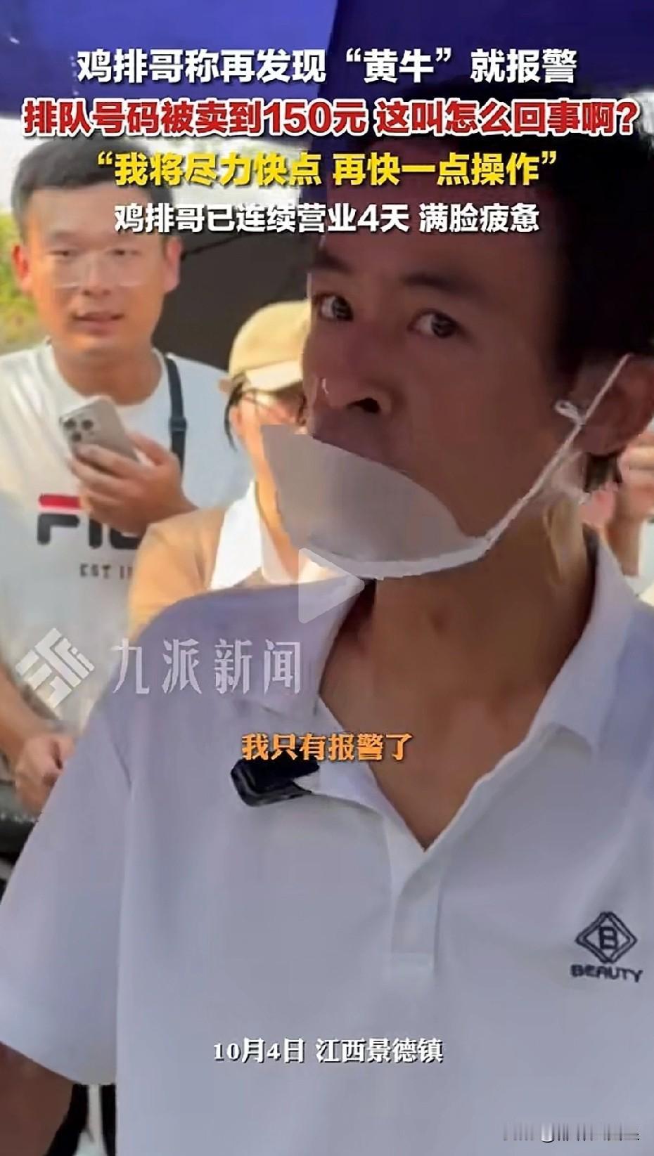 真不明白,有那么好吃吗?有人竟然花150元从黄牛手里买排队票,为了就是早点吃到鸡排哥的炸鸡排。 据媒体报道,4月4日,景德镇鸡排哥的摊前排队的人排成了长龙,有网友发视频称,鸡排哥发现有人花150块钱买了排队票,鸡排哥说,下次我发现再有黄牛倒卖排队号码,我将报警。 咱就不明白了,一个炸鸡排有什么好吃的,一些人为了吃鸡排哥的炸鸡排,竟然排那么长的队,有的人嫌排队等的时间长,竟然花150块钱从黄牛手里买号,到底是买花的人手里钱多?还是几百个的鸡排好吃? 鸡排哥 鸡排哥景德镇 景德镇鸡排哥
