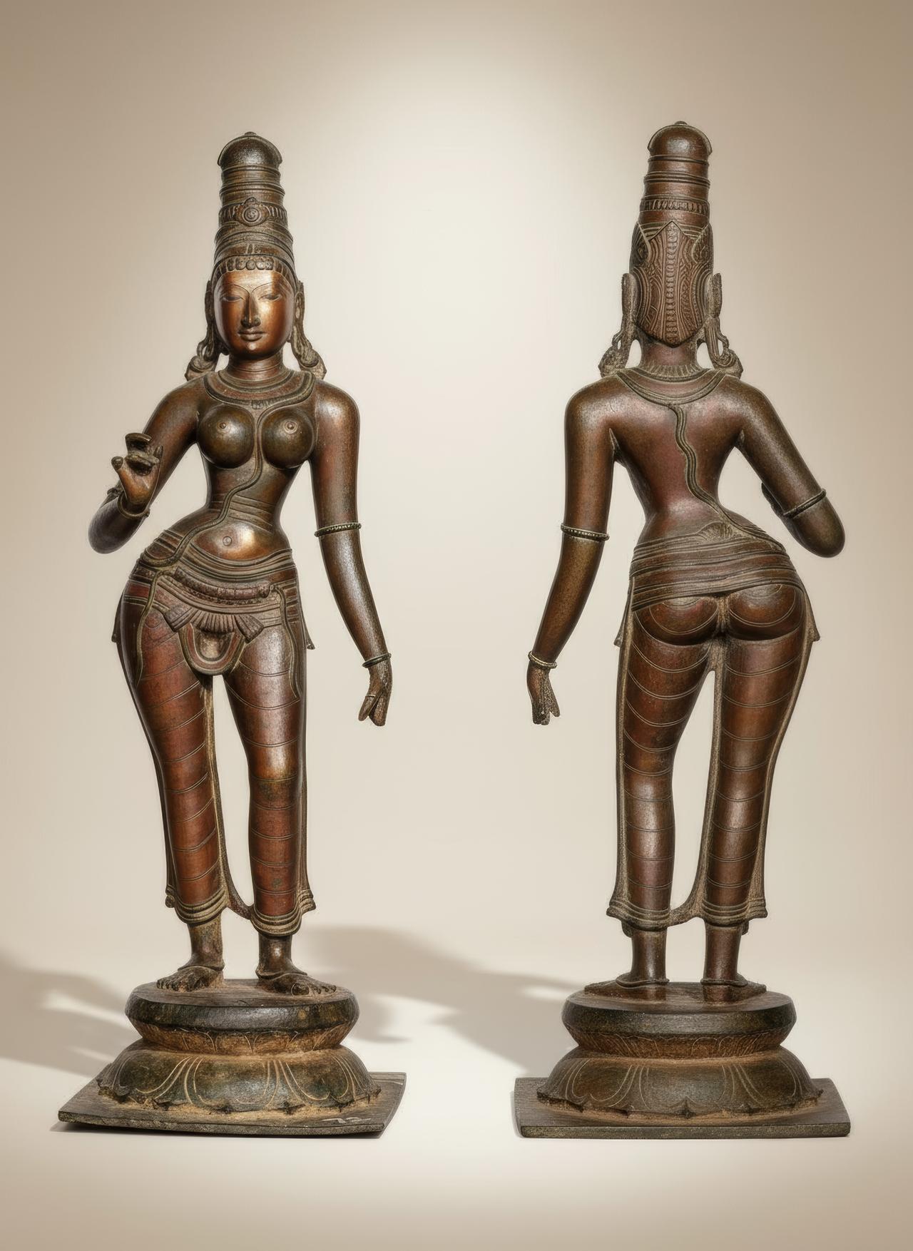700年前印度女神铜像:“S”形三弯式身体曲线太美了!这尊《帕尔瓦蒂(Parvati)大型青铜像》出自印度南部,属于毗奢耶那伽罗(Vijayanagar)时期,约14世纪的艺术杰作。帕尔瓦蒂是印度教中的重要女神——湿婆(Shiva)的配偶,被视为母性、力量与美的化身。这尊青铜像以典型的南印度金属雕塑工艺铸造,展示出高超的技艺与宗教审美的结合。 从正面看,女神的姿态优雅而富有韵律。她的身体微微侧倾,重心落在一条腿上,形成“S”形曲线,这种姿势被称为“三弯式”(tribhanga),象征柔美与生命的流动感。她的面容平静安详,略带微笑,体现出印度宗教雕塑中理想化的神性之美。头部高高盘起发髻,上饰复杂冠饰,耳垂挂有硕大的圆环耳饰,显示出贵族与神灵的尊贵气质。 从背面看,雕塑的线条依然流畅自然。雕刻师在表现女性背部、腰线与臀部时,展现了惊人的造型掌握力。帕尔瓦蒂的身形比例匀称,肌理细腻,铜质表面经过精细打磨,呈现出温润的古铜色光泽,体现出南印度青铜工艺的巅峰水准。 这类青铜像常用于寺庙的节庆巡游(utsava murti),意味着它并非仅供供奉,而是宗教仪式中“活的神像”。毗奢耶那伽罗时期的艺术强调神性与人性之间的和谐,这尊帕尔瓦蒂正体现了这种审美精神:她既是神祇,又具有人间的柔情与生命力。