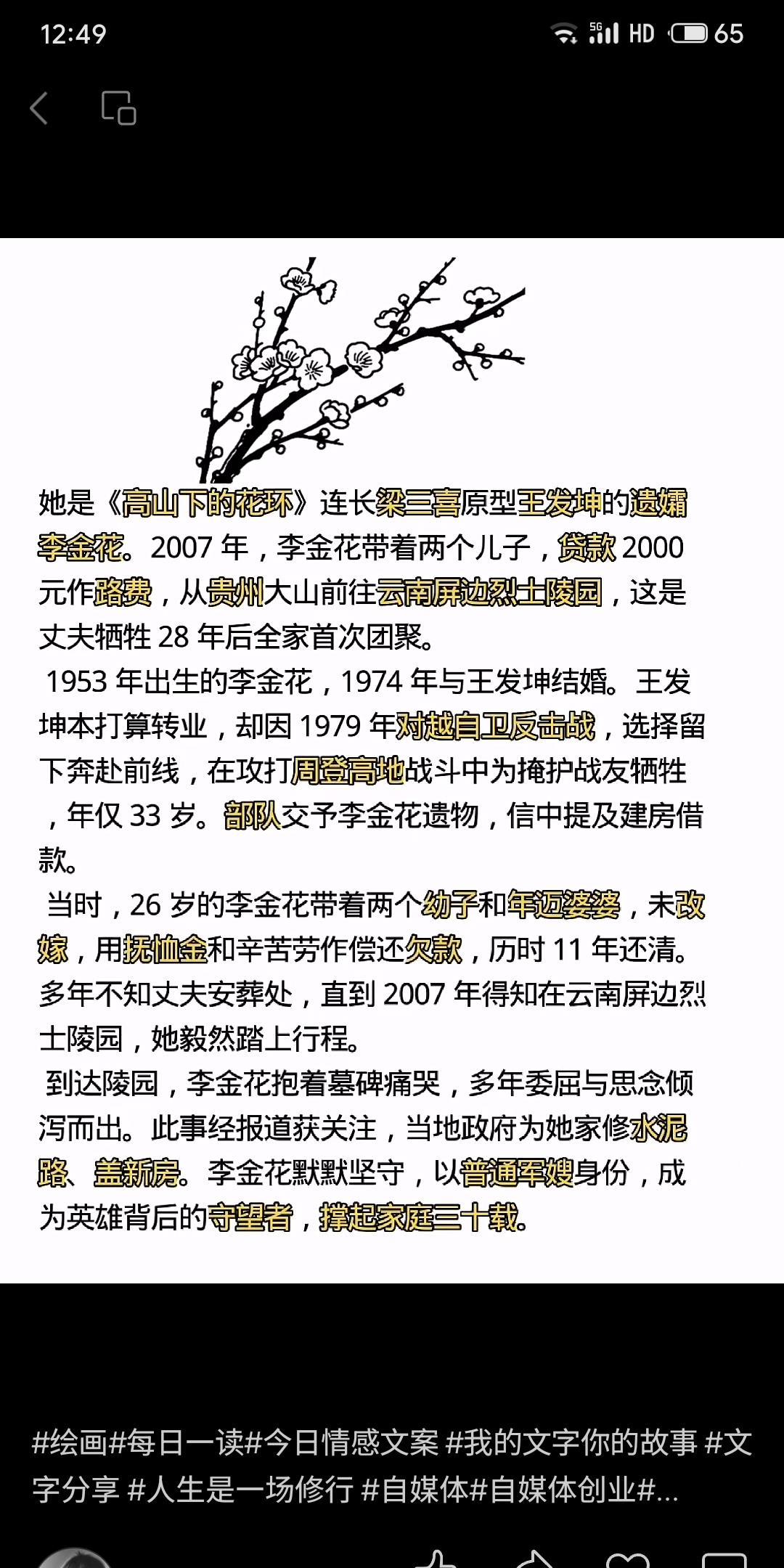 军嫂李金花是烈士王发坤的遗孀。丈夫1979年牺牲后,她独自抚养幼子、照顾婆婆,并用11年还清丈夫生前欠款。2007年,她首次前往云南屏边烈士陵园祭奠,此事经报道后获得社会帮助。她以三十年的坚守,展现了英雄背后平凡而伟大的力量。