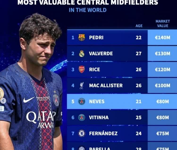 足坛性价比最高的中前卫是谁?内维斯! 内维斯,21岁,身价8000万欧,大巴黎全能中场,他是加图索和马斯切拉诺的结合体,兼具充沛体能、强硬对抗和不俗控场能力,上赛季欧冠淘汰赛阶段创下63次抢断的纪录! 说他性价比高是因为他的身价没有一点水分,8000万欧元全靠拼出来的,没有一点营销和吹捧。另外,他只有21岁,再保持10年巅峰不是问题! 当然,同为全能中场,内维斯目前比不上佩德里,但想用8000万欧元拿下他,那是不可能的,他的价值不能用钱衡量,就像1.4亿欧的佩德里一样,属于绝对的非卖品!