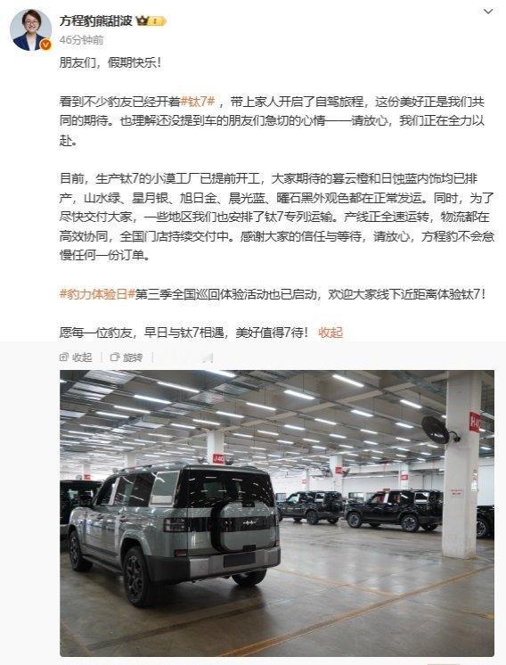 【方程豹熊甜波透露生产钛 7 的小漠工厂已提前开工,暮云橙和日蚀蓝内饰均已排产】
