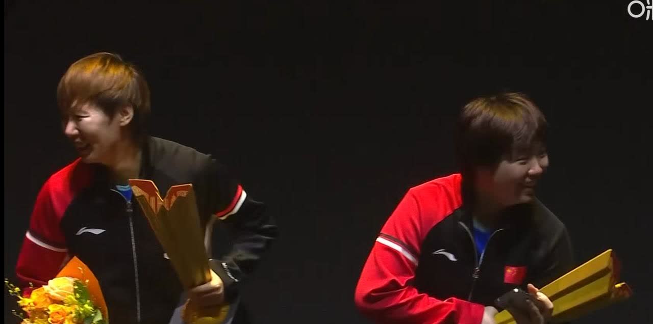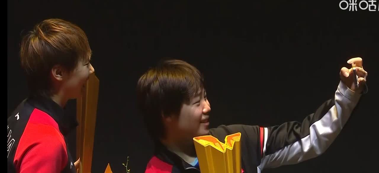 冠军自拍环节,王曼昱和蒯曼开心笑了。 两个人都是一手奖杯一手花,合影时王曼昱就