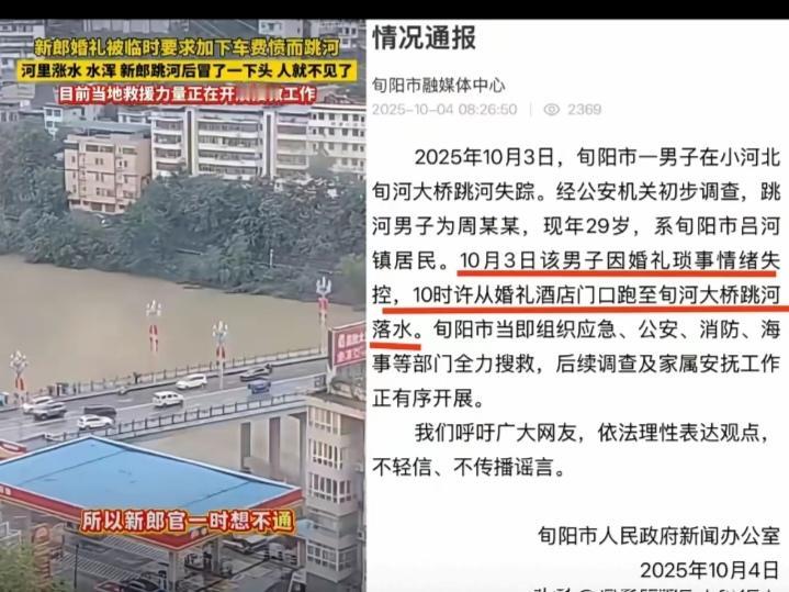 太痛心了!陕西跳河的新郎真是想不开,何必呢,大不了不结婚,还能让女方退彩礼。才2