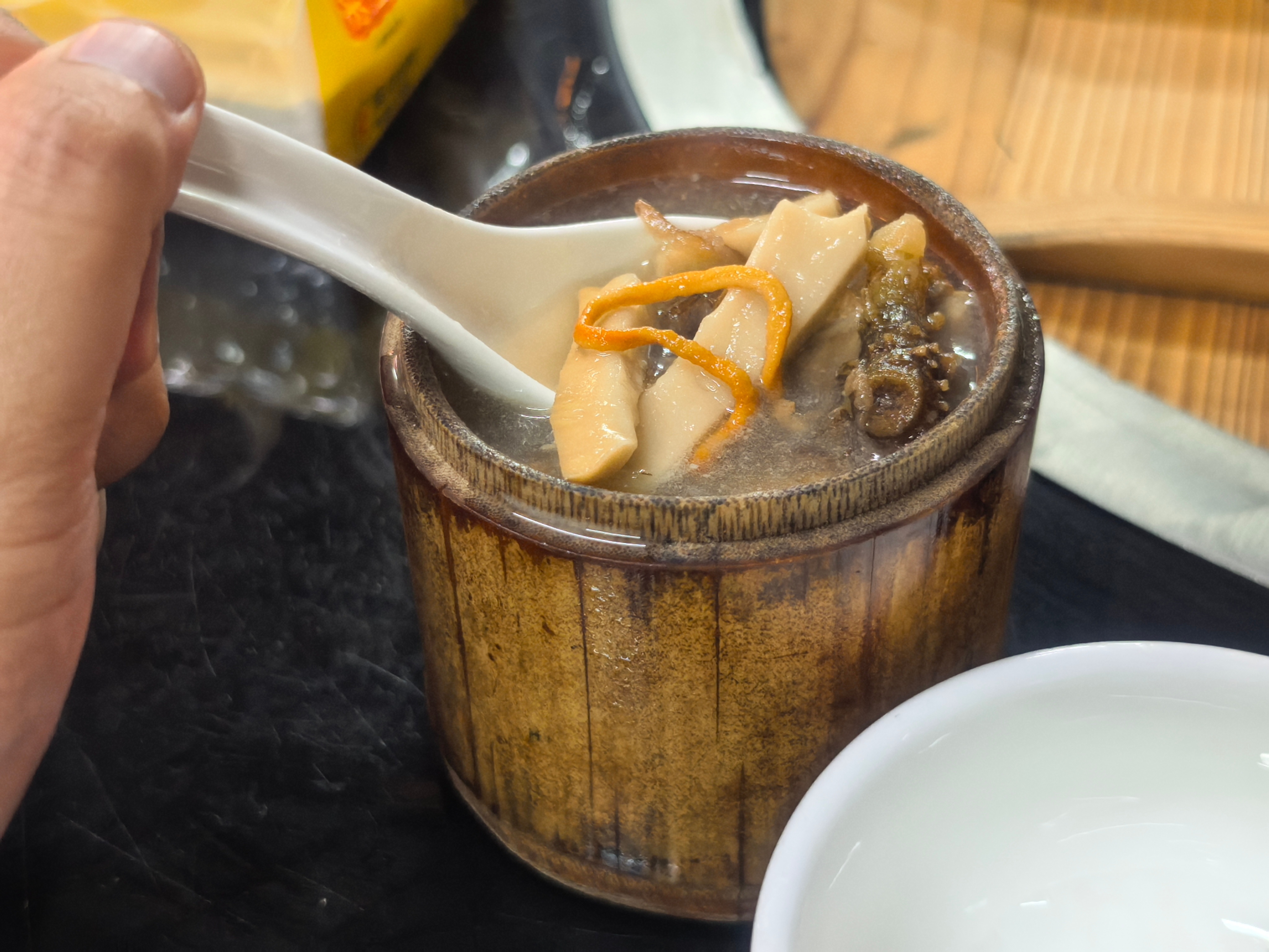这家柴火鸡一绝了,真的是用柴火烹饪,而且大锅的鸡肉才 128 元,而且还有当地特色的竹筒炖汤,我选了海底椰润喉。