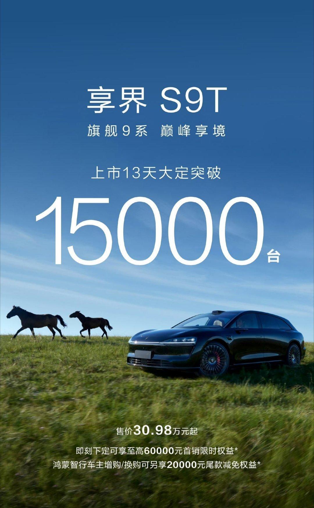 9 月 16 日,鸿蒙智行首款旅行车享界 S9T 正式上市,售价 30.98 万元起。上市首周,该车大定订单便突破 13000 台。而最新官方数据显示,享界 S9T 上市 13 天大定已突破 15000 台。