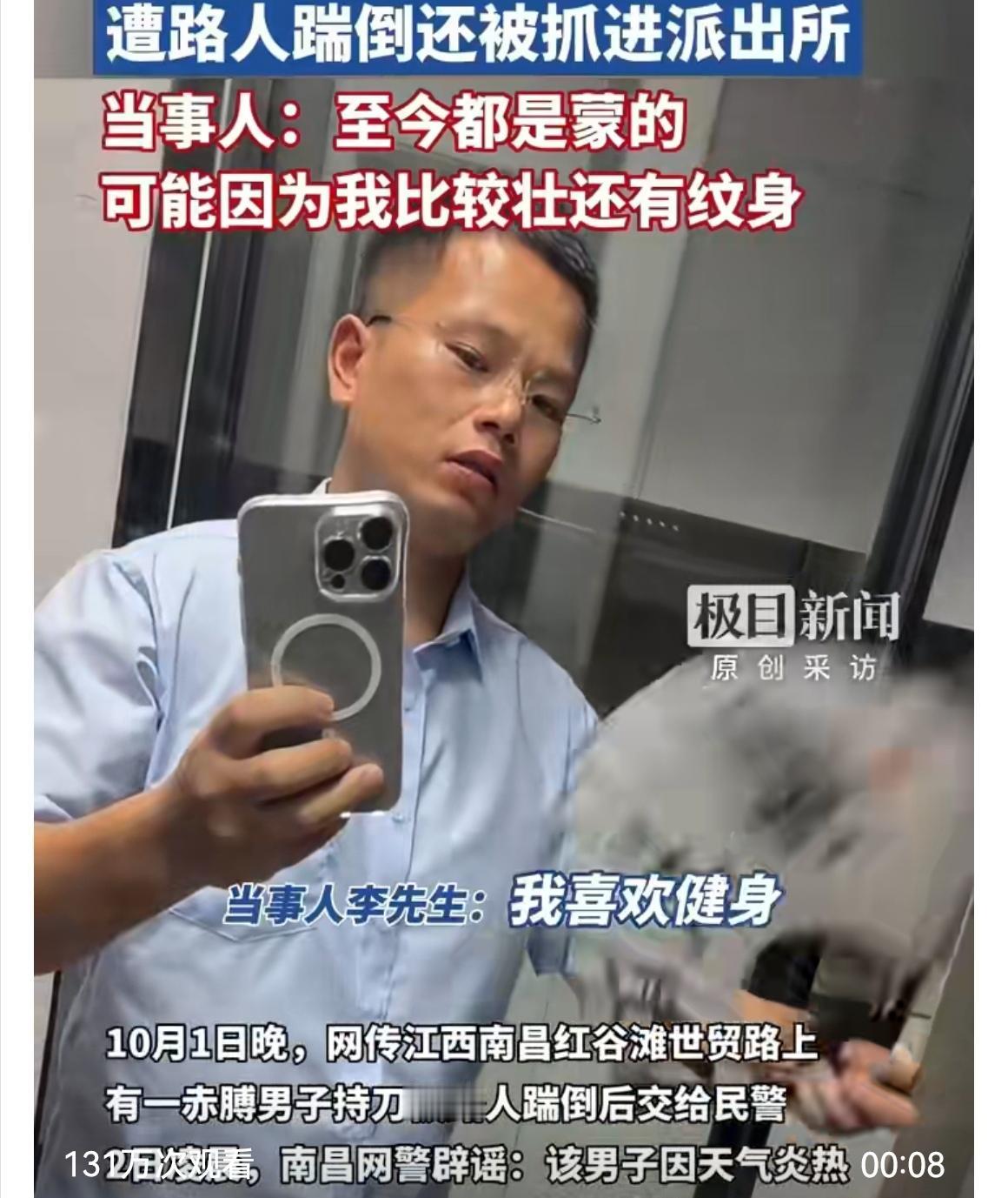 南昌街头误会大戏上演!健身纹身男赤膊拿折扇,被当歹徒踢进派出所 南昌一夜风云突变,10月1日晚,李先生在当地横穿街头赤膊找外甥,手里还拎着一把折扇。壮实体格加醒目纹身,一出场秒变“硬核形象”。偏偏路人高度紧张,竟然将李先生认作持刀歹徒,情急之下直接动手将他踹倒。警察接警火速赶到,把李先生直接送进派出所。整个乌龙事件堪比电影桥段。 10月2日,南昌网警澄清说这只是误会,纯属乌龙。李先生本人隔天还特意拍视频解释,坦言自己平时爱健身,拳击是家常便饭,外表向来“孔武有力”再加上几处纹身,可能让大家多想了。手里的折扇居然被误看成了凶器,整个人也是蒙圈到家。他苦笑直言,这年头体型壮实带点花还真容易被光速误判。 这次闹剧引发网友热议,南昌街头, 搜索瞬间上线,路人怕出事反应也不算慢,但是不是又太敏感了点?一把折扇怎么就变成全员紧张触发器?健身党、纹身爱好者会不会因此更容易被误解,这种“以貌取人”的先入为主还有没有必要?李先生到底冤不冤,街头防范尺度该咋把握,你觉得呢?