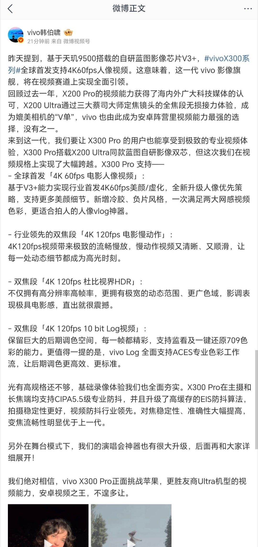 同时根据 vivo 产品经理韩伯啸上月预热,vivo X300 Pro 将搭载 X200 Ultra 同款蓝图自研影像双芯,全球首发“4K 60fps 电影人像视频”,基于 V3 + 能力实现行业首发 4K 60P 美颜 / 虚化,升级人像优先策略,支持更多美颜。