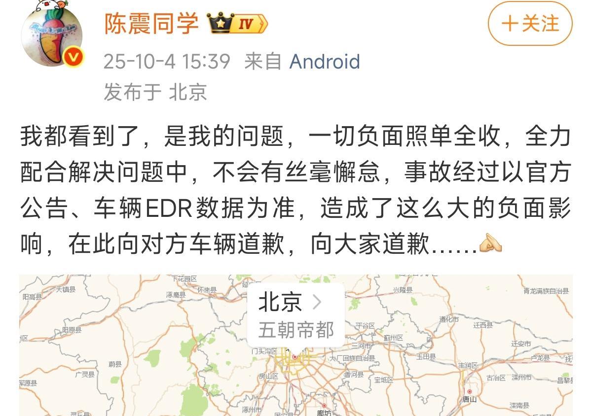 确定了!陈震负事故全部责任!陈震也发微博认责!这个结果结果大家觉得怎么样?