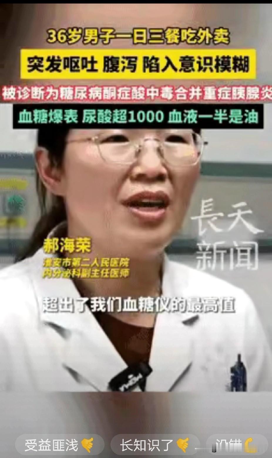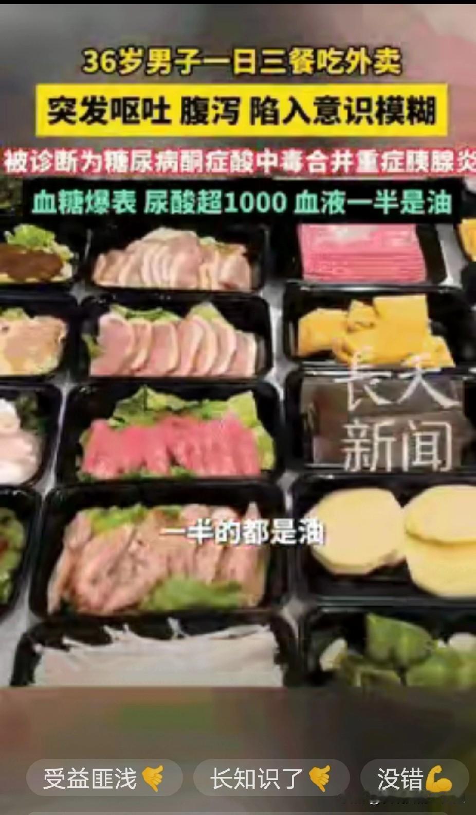 “还敢天天吃外卖吗?”江苏淮安,一名三十六岁的男子,因为工作原因,公司也没有食堂,平日里只能点点外卖,久而久之就对外卖产生了依赖,一日三餐都靠外卖解决,直到有一天男子突发呕吐腹泻,意识模糊,才意识到了问题的严重性,到医院检查后,结果让人冷汗直流!网友:“大盐大肉,就算是换做自己做饭也是一样的结果!” 医生检查后发现,这位男士的血压和“坏胆固醇”水平严重超标,血管已经出现了明显的斑块狭窄。他可不是个例,浙江医院接诊的27岁小伙小邵,一天三顿外卖吃下来,颈动脉几乎完全堵死,还查出了动脉瘤。更吓人的是绍兴一个24岁的年轻人,血液抽出来竟然是奶白色的,血脂值高到连医生都震惊,直接确诊了急性胰腺炎。这些活生生的例子就摆在眼前,外卖依赖真的不是小事。 顿顿外卖背后藏着健康陷阱。商家为了追求浓重的“锅气”和诱人的口味,猛火宽油、高盐高糖几乎是标配。一份外卖的油脂含量动不动就超过45克,比人一天需要的总量还多出一半;一碗酸辣粉的含盐量可能就有8.6克,世卫组织建议两天的盐量一顿就吃下去了。这么吃下去,血管就像被砂纸不停地磨,高血压、高血脂、糖尿病这些慢性病自然找上门。而且外卖的塑料包装盒遇上滚烫的汤汁,会释放出双酚A这类干扰内分泌的化学物质,它们会悄悄溜进食物,增加心血管疾病的风险。 营养失衡也是大问题。外卖订单里绿叶蔬菜的比例低得可怜,连推荐量的三分之一都达不到。餐盒里永远是一大盒米饭配着重油重酱的肉菜,膳食纤维、维生素和矿物质严重不足。时间长了,不仅便秘、口腔溃疡会找麻烦,连免疫力都会下降。有些人觉得“自己做饭放油放盐也不少”,但外卖的油盐量往往超乎想象,而且食材的新鲜度、后厨的卫生状况更是没保障。多少只有外卖窗口、没有堂食的店铺藏在美食广场的角落,卫生状况全靠运气。 话说回来,把健康问题全甩锅给外卖也不太公平。很多上班族是真没时间做饭,工作压力大、通勤时间长,点外卖成了最现实的选择。更深层的原因,是现代人那种追求即时满足的心理代偿。压力大了,就想吃点重口味的、喝杯甜的解压,这种短暂的快乐很容易就变成习惯,甚至成瘾。关键不在于完全禁止外卖,而是怎么聪明地吃。点餐的时候,尽量选清蒸、白灼、炖煮的菜品,避开油炸和红烧。主动备注“少油少盐”,额外加一份蔬菜或菌菇。收到餐后,用热水涮一下过油的菜,能去掉不少表面油脂。周末花点时间准备些黄瓜、番茄、煮鸡蛋这类简单的健康食物,平时搭配外卖吃,能很好地弥补营养缺口。 这位淮安男子的经历,是一记响亮的健康警钟。它提醒我们,便捷不能以健康为代价。点外卖时多一份留心,日常饮食中多一份规划,就是对身体最好的投资。 各位读者你们怎么看?欢迎在评论区讨论。