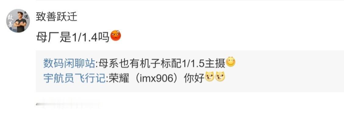 后续有用户在评论区表示:“等级森严 ”,博主回复道:“已经越级很多了,只是刀微距而已”;另一名用户则询问道:“母厂是 1/1.4 吗 ”,博主则回复道:“母系也有机子标配 1/1.5 主摄 ”。