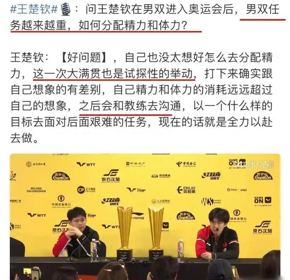 王楚钦亲自揭晓谜题:洛杉矶,他选男双,不选混双。中国大满贯男双夺冠后,王楚钦直言,这次是试探,他发现自己真的无法兼三项,这体力消耗太大了。 自从男双入奥,王楚钦面对一道非常艰难的选择:原本想专注单打的他,一下子被扯入了男双以及混双两头的保冠备战之路。 王楚钦在北京大满贯以奥运会的标准体验了一下在这个年纪继续身兼三项,一天三赛,以必须夺冠为目标是什么感受。 他的体验效果出来了:我真的再也做不到了。我老了,体力精力都不能再这么消耗了。 那么问题简化成了到底是男双还是混双? 王楚钦明示了这件事情:我要把之前学到的男双经验传授给林诗栋,与他好好磨合,进行未来的战略与备战,我们需要一起好好沟通。 其实东京奥运会的日本混双大成功后,巴黎奥运周期,强势协会一哥一姐们全部出动,希望能够以此为夺金点。 为了重新夺回丢失的颜面,国乒也是派出了精锐部队,100%全情投入全面备战。 但是混双其实不是国乒一哥一姐们的常态优选。 你会发现马龙、张继科、樊振东谁都有世乒赛男双冠军,但是谁也没有世乒赛混双冠军,但这项内容,从不影响他们的考评。 因为如果你备战男双,你准备的对面选手都是可能出现在单打阵容里的,男双训练对手都是男运动员,陪练质量更高。 而如果你选的是混双,你得去认真琢磨很多女选手的特殊打法,男线是没这么多特殊打法的。 而对于王楚钦而言,他的混双生涯已经成功到不知道还能怎么成功了,这块版图,他什么荣誉都有了,高处不胜寒,再走下去,只有下坡路了。