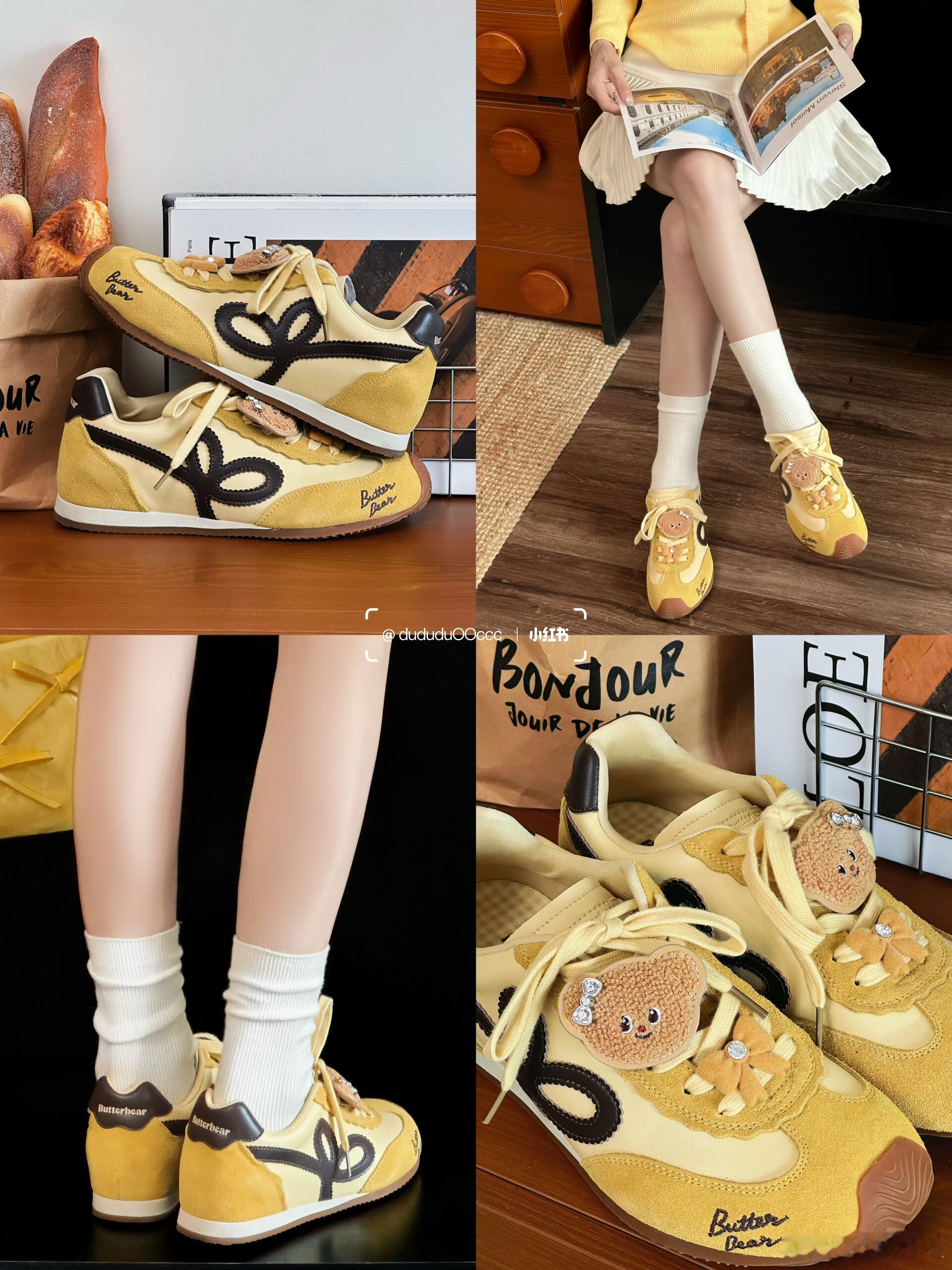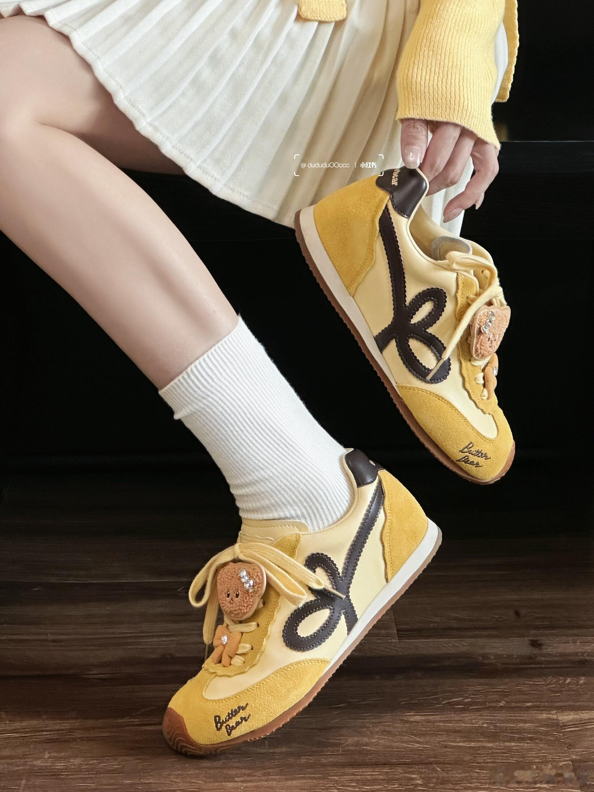 这双米白色运动鞋以极具辨识度的巨型深棕近黑色蝴蝶结装饰夺人眼球,绒面革与光面皮革