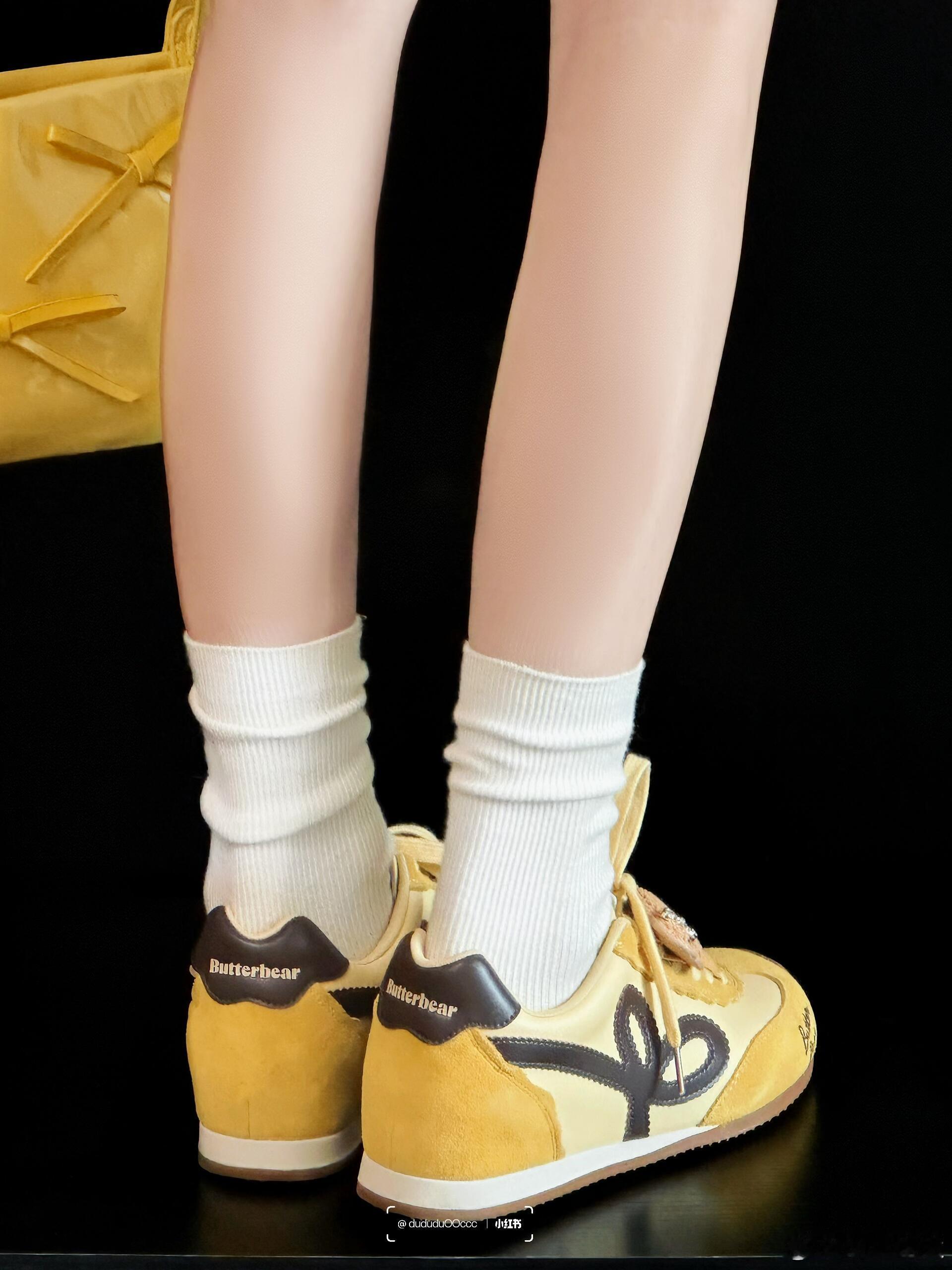 这双米白色运动鞋以极具辨识度的巨型深棕近黑色蝴蝶结装饰夺人眼球,绒面革与光面皮革的拼接材质赋予鞋身丰富质感。鞋舌处点缀着镶嵌闪亮珠饰的立体桃心吊坠,与同色系鞋带共同烘托出甜美复古气息。醒目的棕红色鞋底为柔和主调注入活力碰撞,侧边蝴蝶结边缘的精巧打籽绣细节更显工艺考究。搭配的白色罗纹中筒袜与淡黄针织衫、白褶裙摆构筑出整体柔美氛围。采用低角度仰拍的独特视角,在深色木纹与纯黑背景的衬托下,既凸显了鞋款的戏剧化设计,又通过冷暖色调对比强化视觉张力,完美融合了少女感与时尚态度。时尚鞋履SOTD鞋控的日常