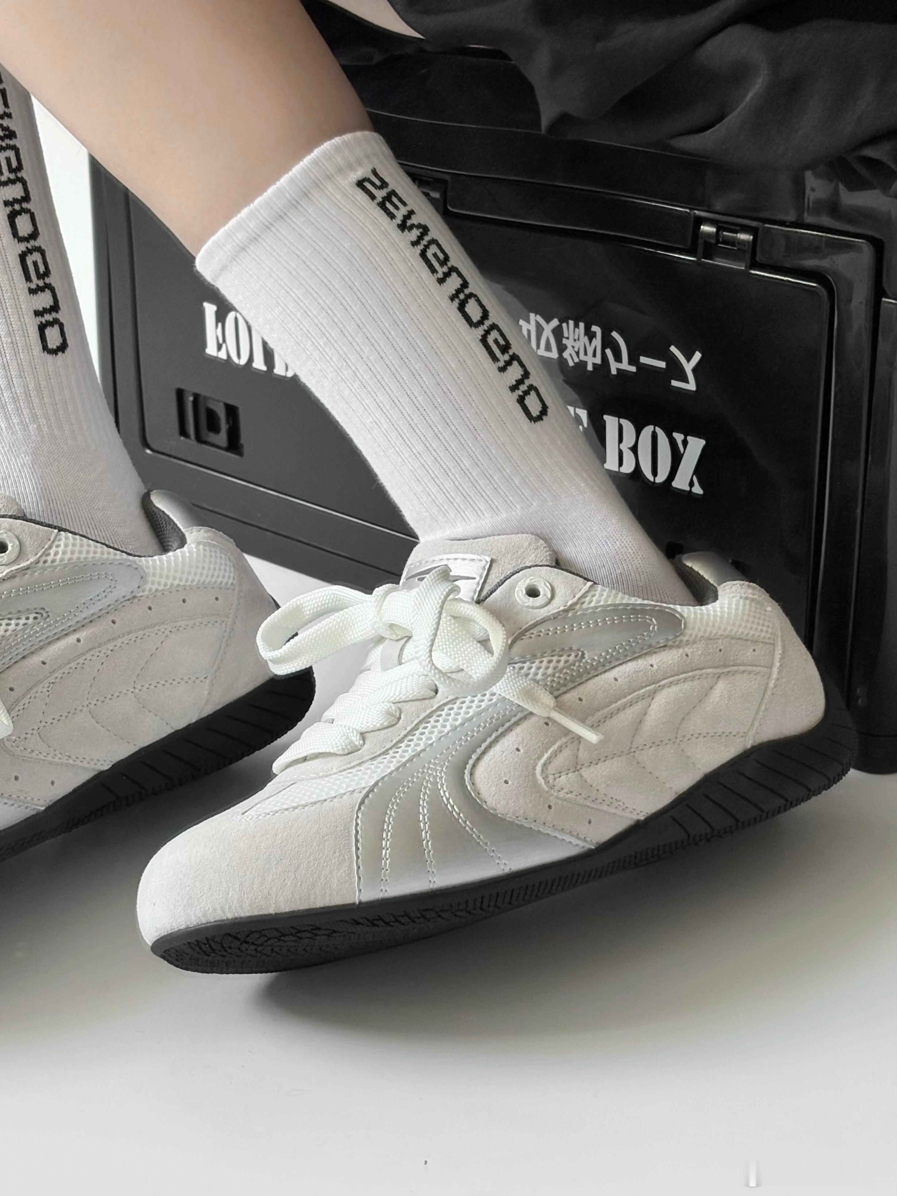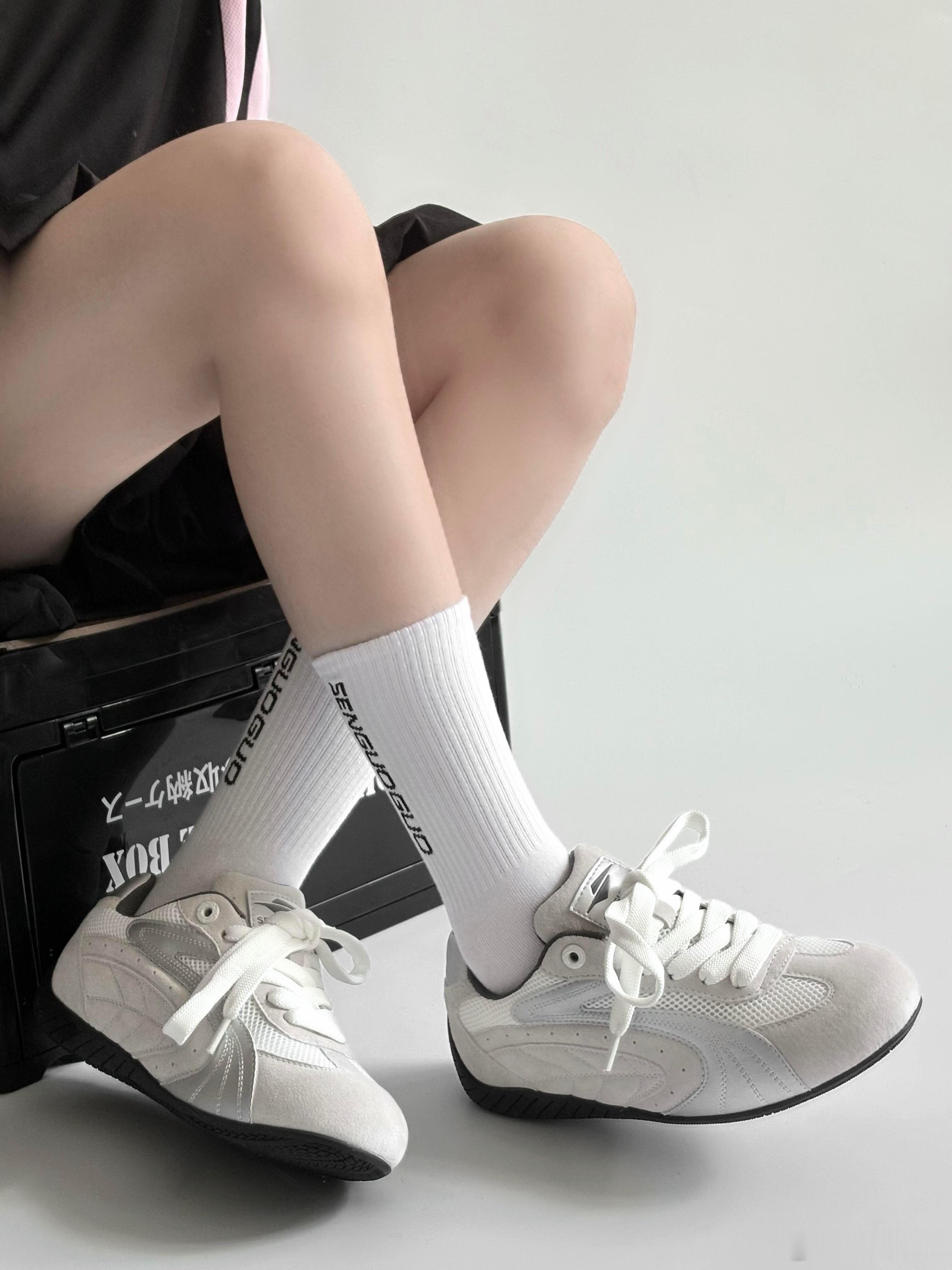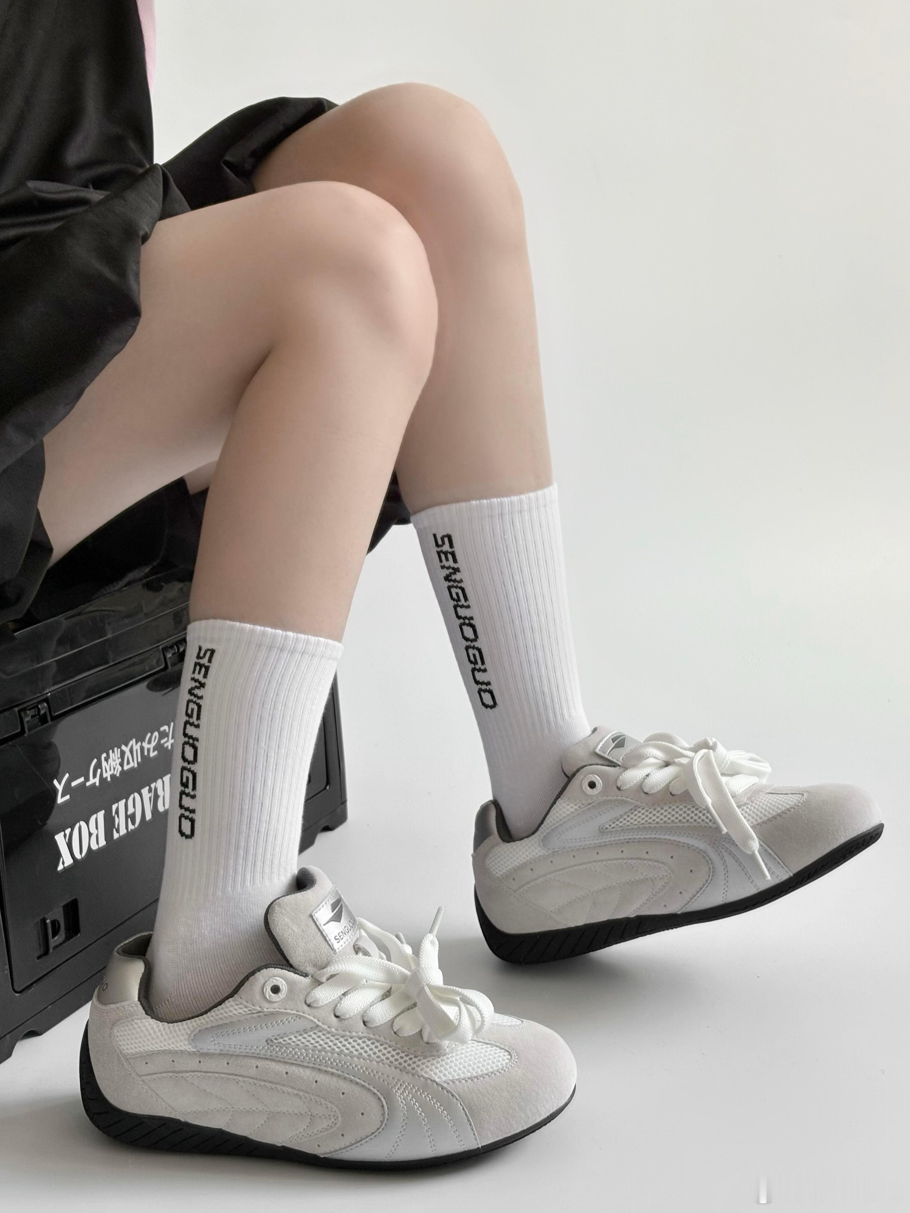 这双低帮运动鞋以高级灰麂皮与透气网眼材质拼接制成,完美融合复古质感与现代机能美学。鞋身采用不对称的深浅灰色块设计,搭配纯白鞋带与黑色厚底形成鲜明视觉层次。侧身隐约可见的"SENG"品牌标识与后跟处的"OUT OF SNEAK"字样彰显其街头基因,而袜筒上"SENSATION"印花则巧妙呼应了整体的潮流态度。鞋舌部位的立体填充结构与特殊系带系统提供了出色的包裹性,黑色橡胶外底赋予稳健支撑。搭配的白色高筒袜不仅强化了运动氛围,更通过堆叠穿法增强了造型的层次感。整体设计在简约的灰白黑配色中展现丰富细节,既适合日常穿搭,亦能胜任轻度运动需求。时尚鞋履SOTD鞋控的日常