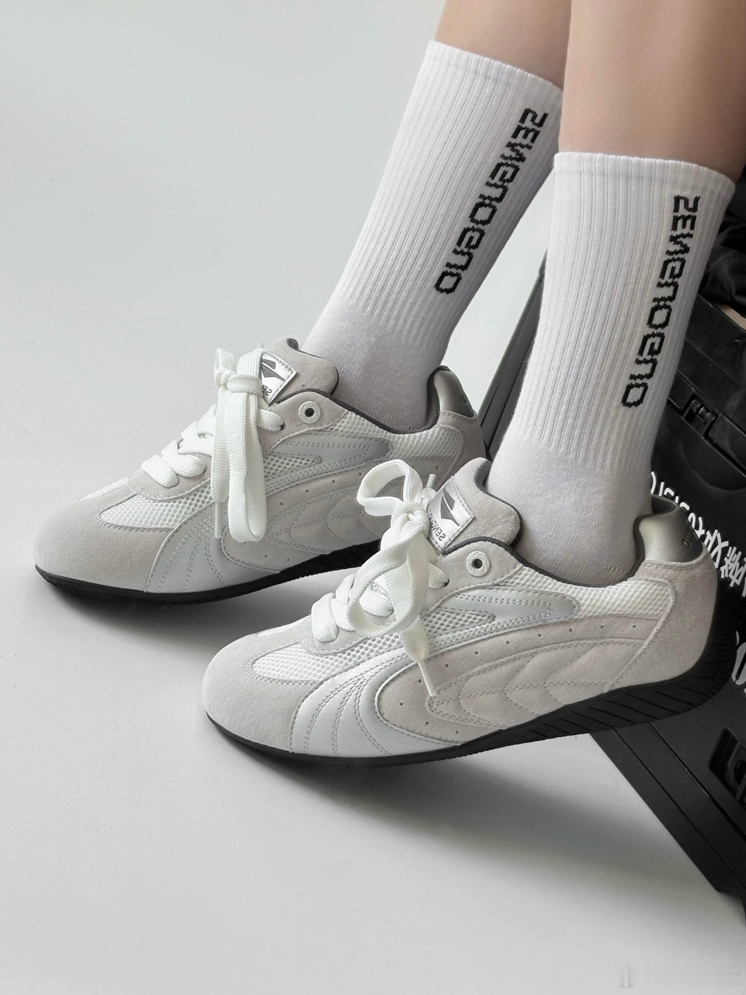 这双低帮运动鞋以高级灰麂皮与透气网眼材质拼接制成,完美融合复古质感与现代机能美学