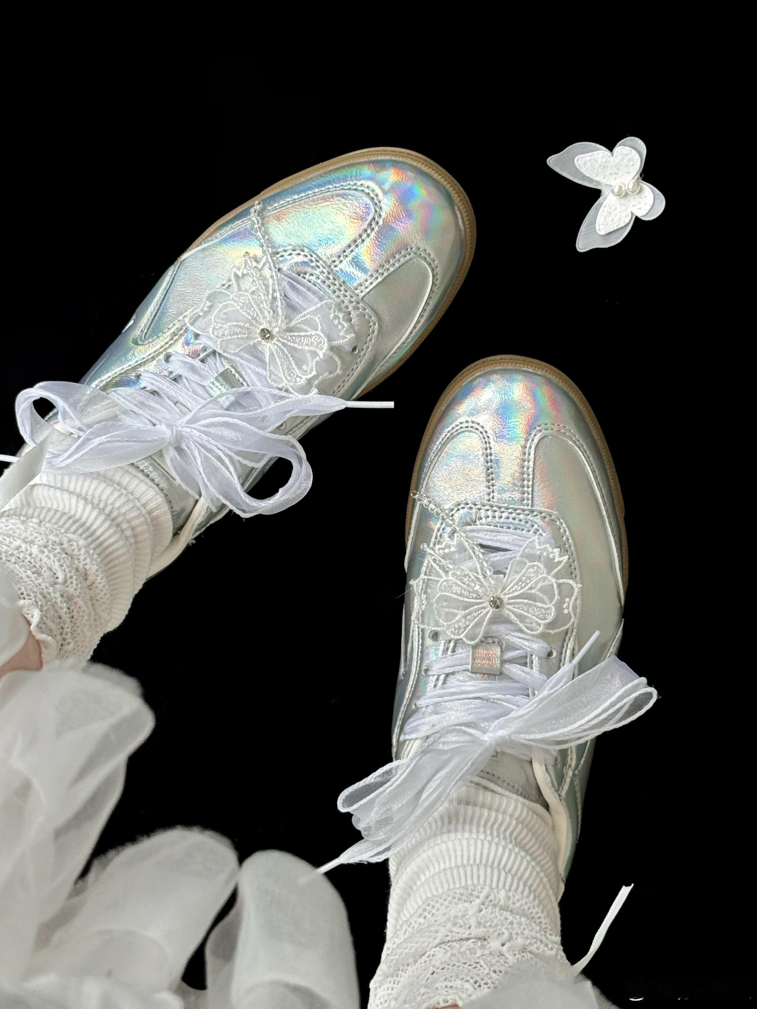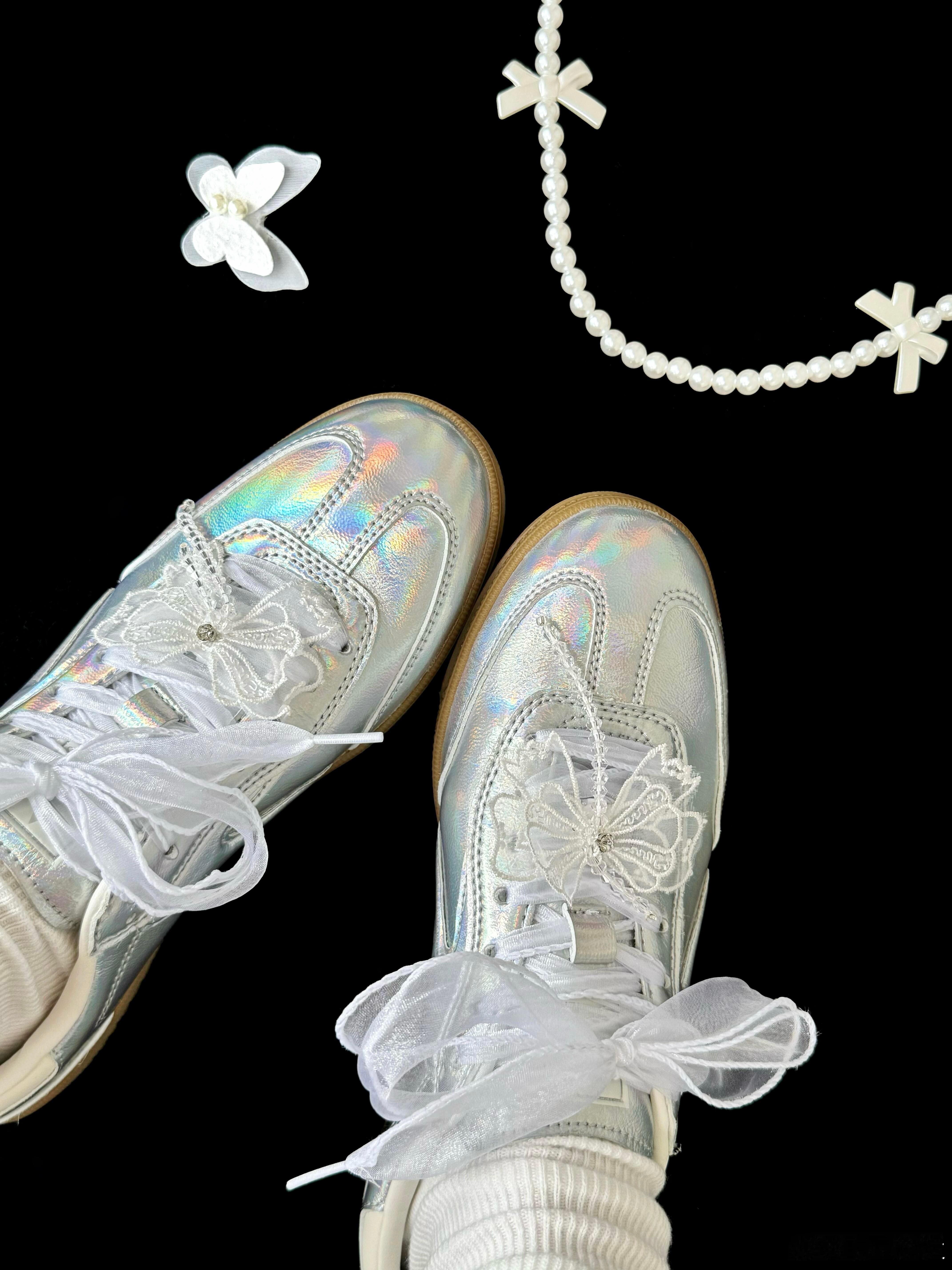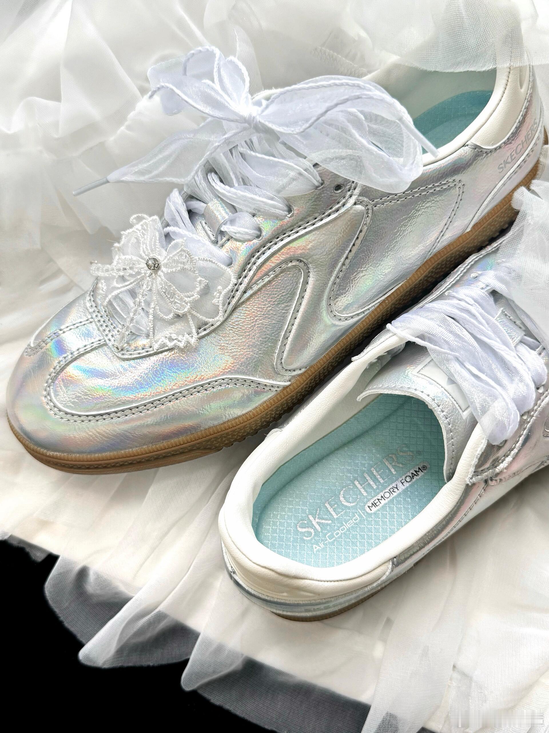 这双运动鞋以未来感十足的金属银色为主调,鞋面采用高光泽度材质打造出流动的炫彩效果。白色鞋带与金属鞋身形成鲜明对比,为整体注入清爽活力。鞋型线条流畅,兼具运动机能与时尚轮廓,侧边隐约可见的镂空结构透出精妙的层次设计。搭配的白色蕾丝边短袜以精致花纹弱化了鞋款的冷硬感,刚柔并济的搭配彰显出混搭美学。背景中的灰色迷你手包以简约造型呼应主视觉的现代感。在纯黑背景衬托下,鞋袜组合犹如舞台焦点,既展现科技感的前卫风格,又通过细节处理保留了日常实穿性,完美平衡了概念化设计与实用主义。时尚鞋履SOTD鞋控的日常