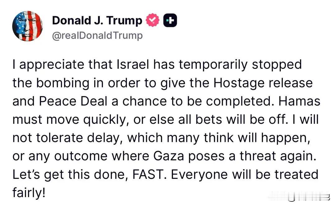 特朗普赞赏以色列暂时停止轰炸,以便为释放人质和达成和平协议提供完成的机会。哈马斯必须迅速行动,否则一切都将泡汤。他不会容忍拖延(许多人认为会出现这种情况),也不会容忍加沙再次构成威胁的任何结果。让我们尽快解决这件事。每个人都会得到公平对待!