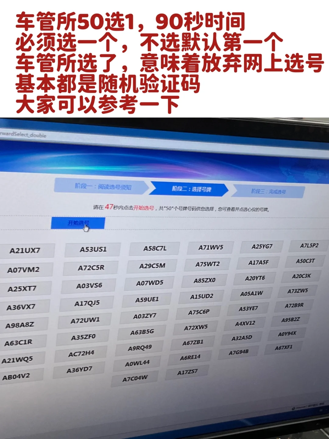 车管所选号则视为放弃网络选号,车管所50选一,随机号码,找几个人一起看,不然来不及,只有90秒,建议60秒确定,避免出现网络异常情况。