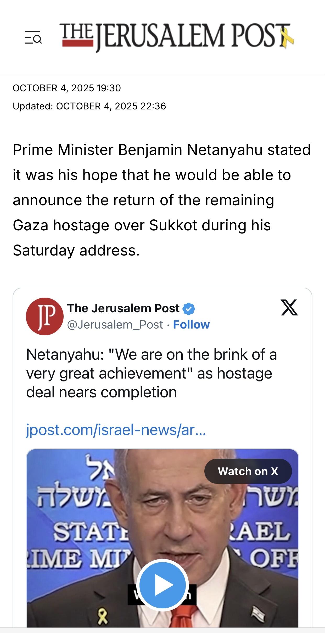 以媒:内塔尼亚胡声称哈马斯改变立场正是因为以色列采取了军事行动的结果 以色列《耶路撒冷邮报》官网10月4日报道:以色列总理本雅明·内塔尼亚胡表示,他希望能在周六的讲话中宣布,在住棚节(Sukkot)期间释放其他加沙人质。 报道说,内塔尼亚胡还说,有说一年前哈马斯就准备释放所有人质,这不过是“彻头彻尾的谎言”。这位总理表示,他的批评者声称“哈马斯一年甚至两年前就准备释放我们所有的人质,而不需要以色列国防军完全撤出加沙”,”这完全是谎言。哈马斯立场的改变正是因为我们施加了军事和政治压力”。 内塔尼亚胡说,如果战争过早地结束,那么以色列就不可能协助推翻“阿萨德政权”,消除伊朗核弹和弹道导弹威胁。他说:”我们所取得的一切成就,都要归功于你们所有人”。 报道说,内塔尼亚胡表示,以色列作为一个整体,已经挫败了敌人的毁灭计划。“从加沙到拉法,从贝鲁特到大马士革,从也门到德黑兰,我们共同取得了伟大的成就。从胜利走向胜利,我们正在改变中东的面貌”(“From Gaza to Rafah, from Beirut to Damascus, from Yemen to Tehran, together we have achieved great achievements. From victory to victory, we are changing the face of the Middle East.”)。 报道说,内塔尼亚胡说,在协议的第二阶段,“哈马斯会被解除武装,加沙地带会非军事化”,并补充说,“根据特朗普的计划,这要么靠外交来实现,要么由我们靠军事来实现”。 报道说,在发表讲话之前,内塔尼亚胡召见了国家安全部长伊塔马尔·本-格维尔和财政部长贝扎雷尔·斯莫特里奇。会后,本-格维尔发表声明称,如果哈马斯继续存在,他将在所有人质获释后离开政府。他说:“除了解救人质这一重要目标外,这场战争的主要目标源于哈马斯怪物在10月7日(指2023年—译者注)制造的大屠杀,那就是恐怖组织哈马斯不能继续存在,必须摧毁它”。 斯莫特里奇则表示,”(内塔尼亚胡)总理决定停止打击加沙,并首次在没有炮火下进行谈判,这是一个严重的错误”。他称,“这肯定是哈马斯在拖延时间,这也会逐渐削弱以色列的地位,无论是在72小时内一次性释放人质方面,还是在消除哈马斯和全面解除加沙武装的核心战争目标方面”。 报道的原标题是《Netanyahu: It was a 'complete lie' that Hamas was ready to release the hostages a year ago》(内塔尼亚胡:哈马斯一年前就准备释放人质是“一派谎言”)。