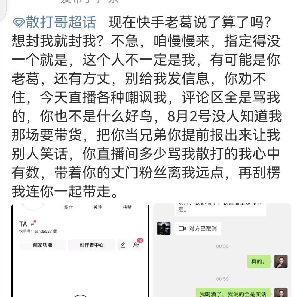 散打账号被TA,“天花板”组合因内讧分道扬镳? 散打再次酒后喊话老葛为自己抱不平,想封我就封我?咱慢慢来,咱俩指定得没一个!还有方丈,你也不是什么好鸟,再刮楞我连你一起带走。 这剧本是不是假戏真做,真急了,如果不是剧本的话,散打道出了实情,即太原老葛和方丈利用完自己就想把他甩了,感觉被玩的散打不甘心掀桌子不了。 按丁老五的话,和太原老葛合作前,我打哥就表明态度,自己不会和辛巴合作,自己也不会直播,到时候让老葛给他引流,老葛旗下艺人分别在他的账号上播,然后自己管理幕后,让自己的互联网事业迎来第二春。 没想到都是算计,我打哥一直把老葛和方丈当兄弟掏心掏肺的,希望他们这个“天花板”组合能越走越远,结果为了各自利益又背叛了散打,他们只顾自己,把流量看得比命都重要,没有一个真心对散打的,合起伙来欺负他,我打哥能不伤心吗?能轻易放过老葛和方丈吗?