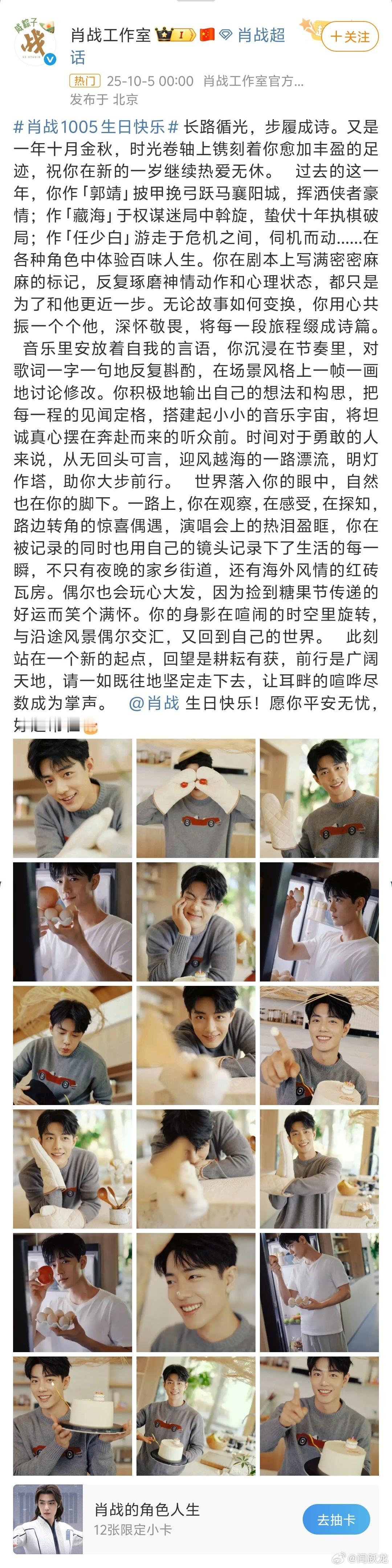 从粉丝笔下“居家男友”的温暖期许,到工作室长文里对角色深耕的梳理,肖战34岁的生日氛围,藏着他作为演员与公众人物的双重成长轨迹。