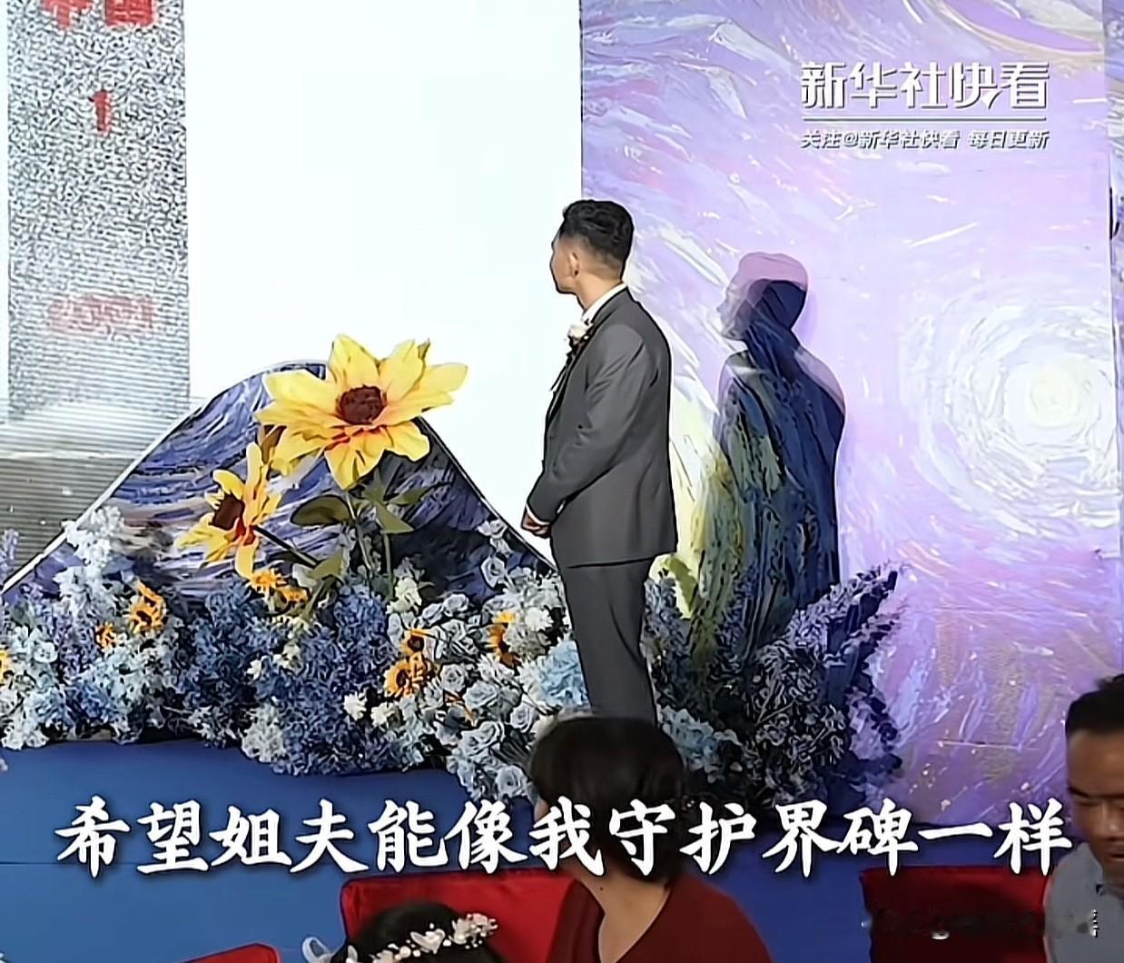 “泪目了!”浙江一位姐姐婚礼上,大屏幕突然切到几千公里外的边防哨所。弟弟站在大雪里,身后是那块“中吉1号界碑”。他说“姐,我不能陪你出嫁了,希望姐夫能像我守护界碑一样的守护你”,新娘的眼泪一下子就止不住了。 说真的,我觉得弟弟把“守护界碑”和姐夫的婚姻责任放在一起说,特别戳心。他人虽然没到婚礼现场,却用实际行动教会了我们什么是真正的守护。 现在年轻人真的在重新定义什么叫“陪伴”。人在不在身边不重要,心里装着彼此才最珍贵。说实话,弟弟这种“虽然人没到,但心意满分”的祝福,反而比普通婚礼致辞更让人感动。 边防线上的雪化了还会再下,但这份情谊永远不会变。正是有无数个像弟弟这样的守护者,我们才能安心过日子。他们放弃了陪伴家人的机会,换来的是千家万户的团圆,要我说这就是我们这个时代最动人的故事。