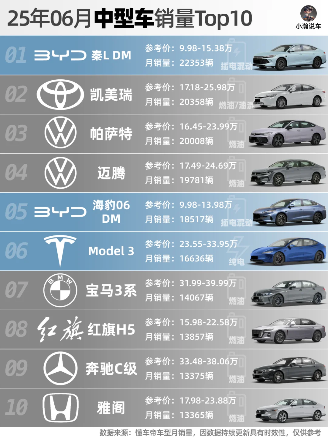 🌟中型车:比亚迪秦LDM超越丰田凯美瑞登顶,帕萨特和迈腾分列3、4位,另一998“工业奇迹”海豹06DM也稳定在前5。Model3回升至中型车榜第6位!