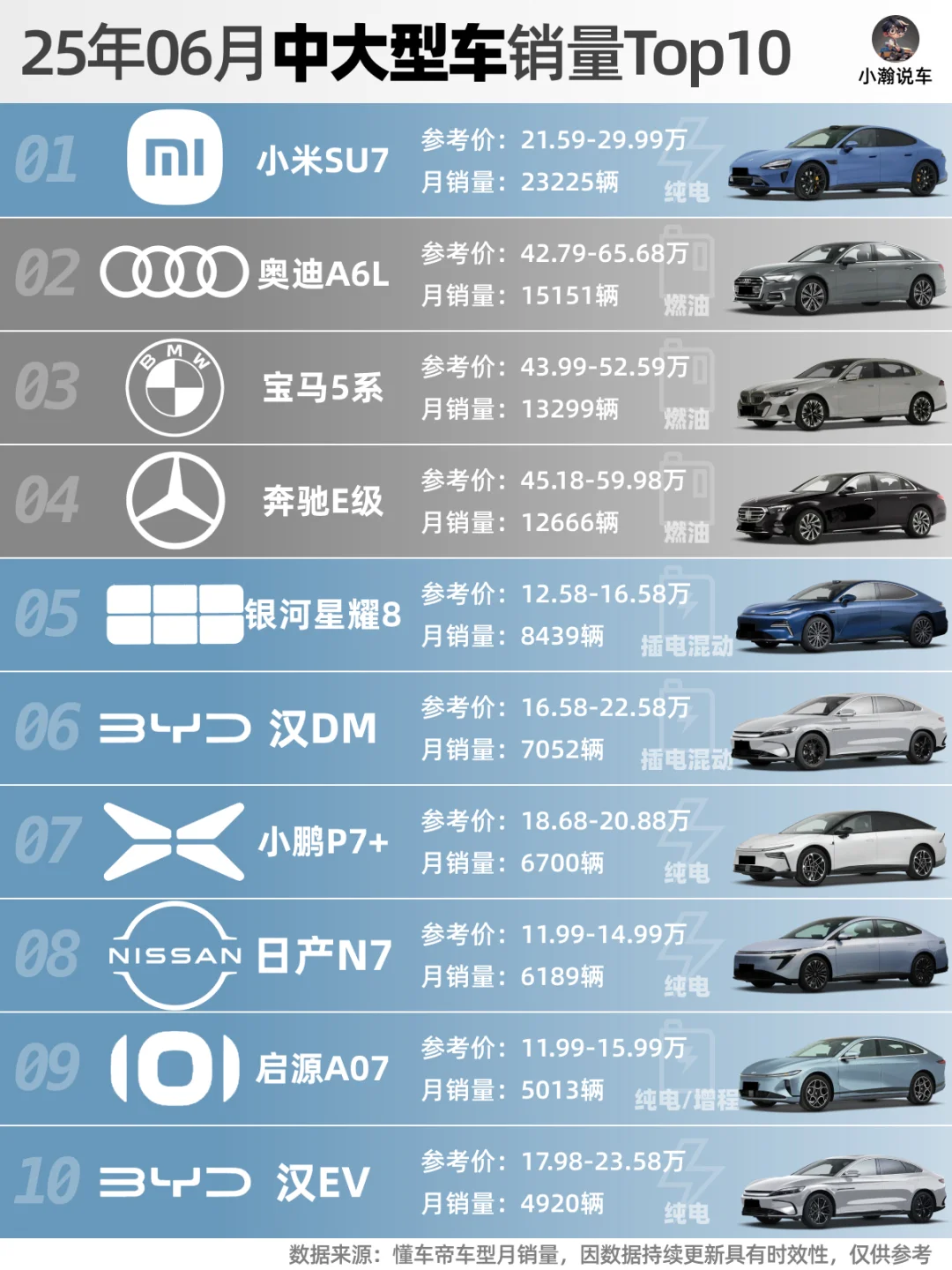 🌟中大型车:小米SU7地位依旧稳固,但明显6月给YU7分走了部分产能。只是除了SU7确实没有其他车型能撼动56E的地位。合资纯电爆款日产N7上榜。