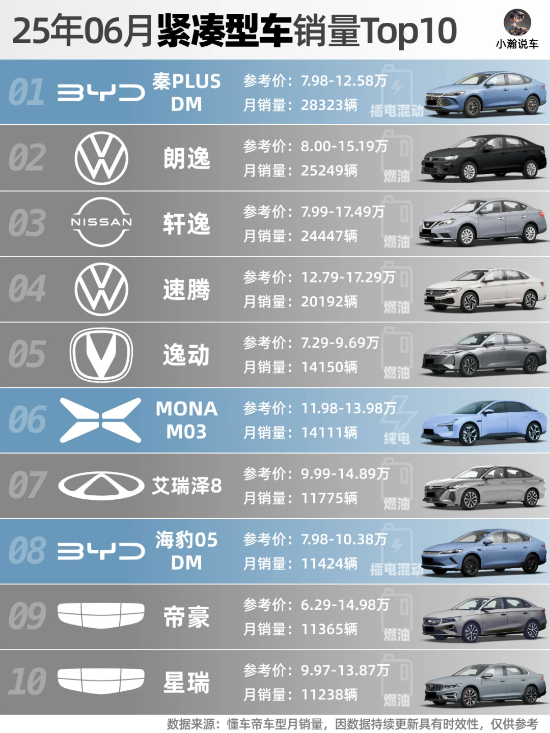 纯电小车 6月汽车销量 轿车销量 比亚迪秦 小米SU7 56E 油电之争 之后小型车TOP10还会有燃油车吗