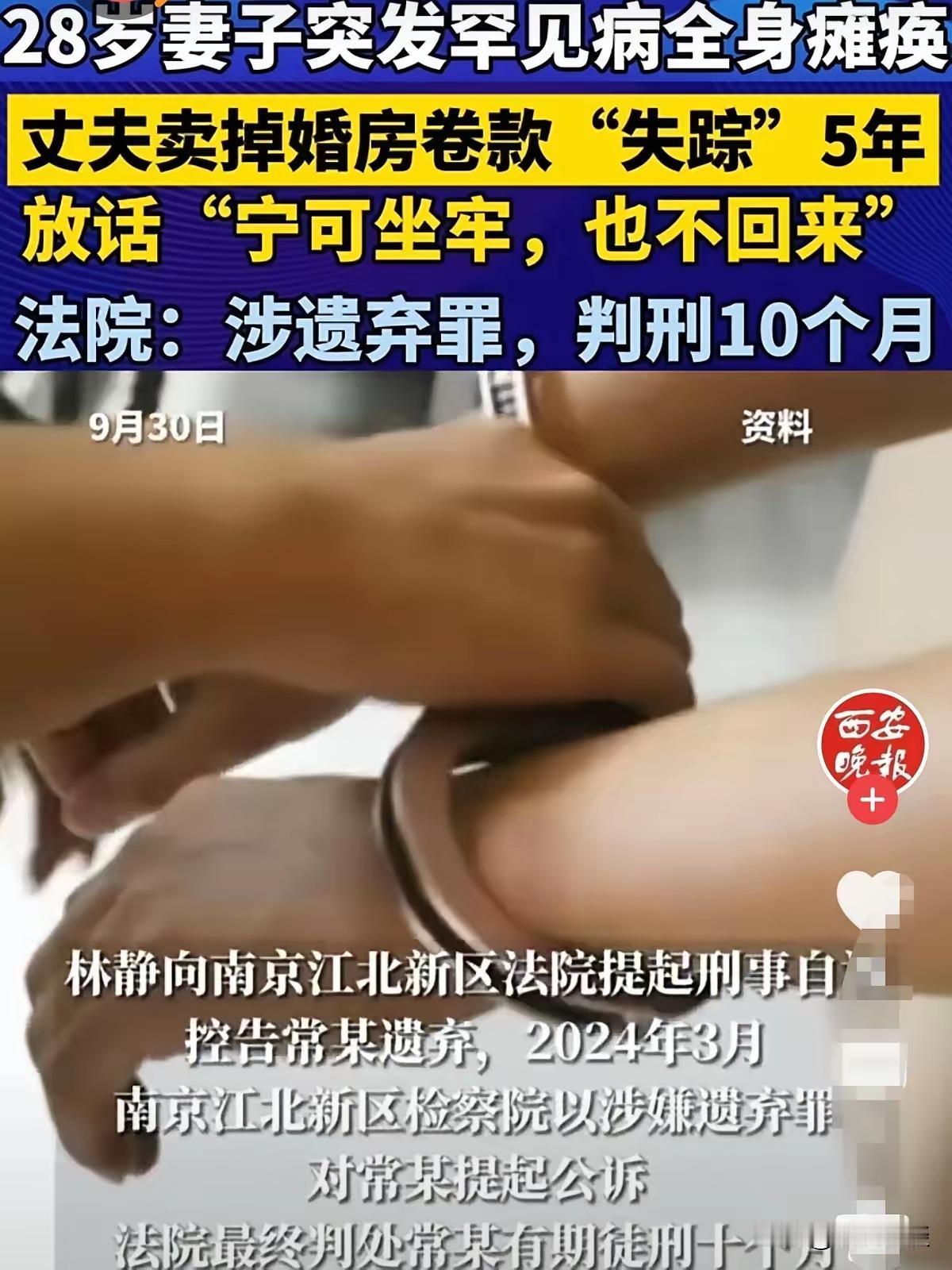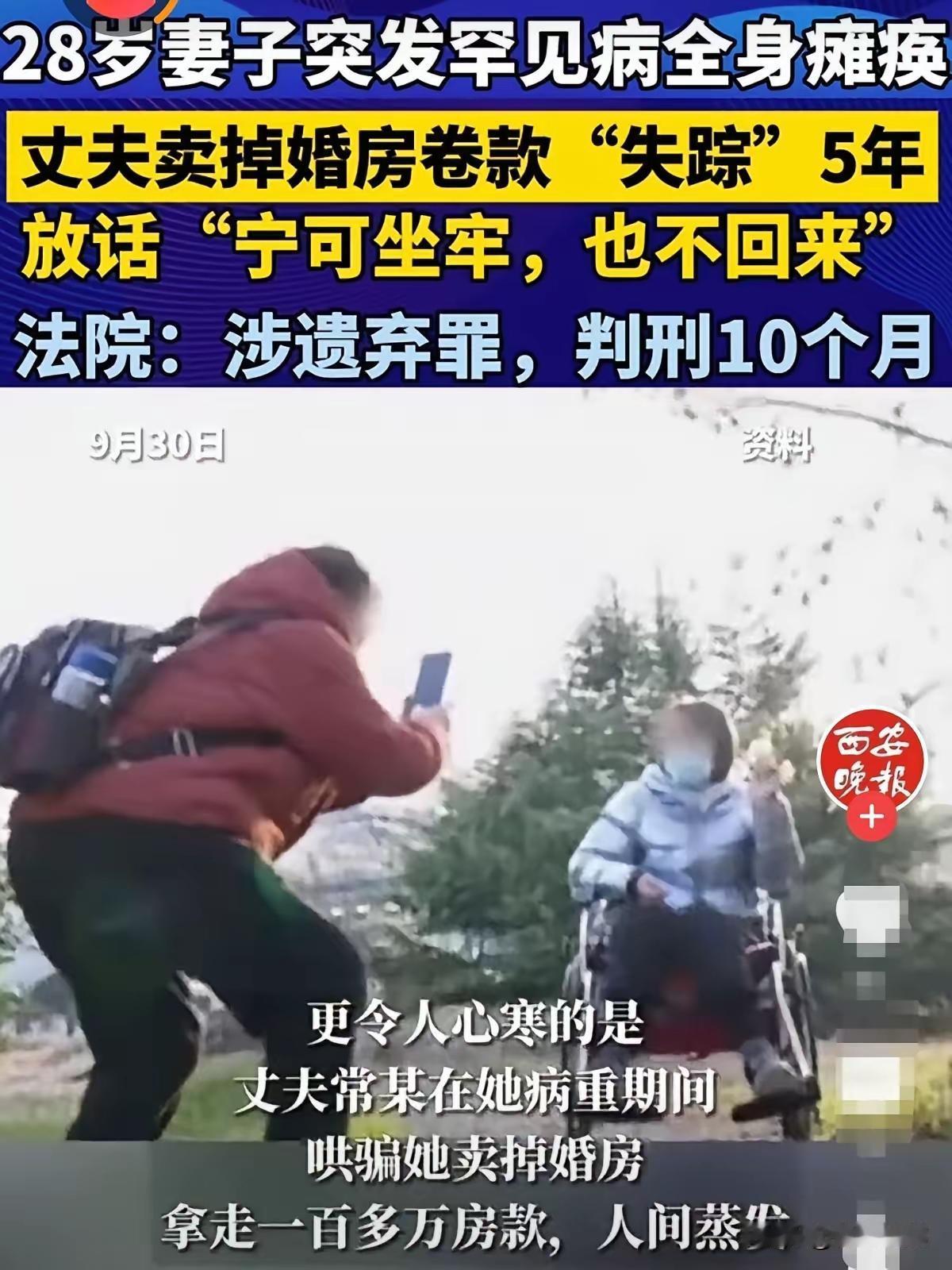 江苏南京,28岁女导游,结婚4年突患重病全身瘫痪,丈夫不想受拖累,就哄妻子卖掉婚房,本以为卖房救命,没想到丈夫拿着100多万跑了,整整5年杳无音讯。女子生活陷入绝境,一纸诉状把丈夫告上法庭,可因不知道男子踪迹,案件受阻,后来检方看不下出了,协助介入警方立案侦查,男子被抓后扬言:宁可坐牢,也不回去。 因涉遗弃罪,法院判刑10个月! 信息来源:西安晚报 网友评论: 判的太轻,才判10个月,这种渣男应该严惩,他不光是遗弃罪,还涉嫌盗窃罪或诈骗罪,最少判他十年八年。[发怒] 判的太轻了,不疼不痒的,10个月刑期换来100万的安全,对这样的坏人来说太值了。 就这捐款潜逃就是重大刑事案件。判决的担当、专业素质水平呢? 他为什么宁可坐牢也不回去。一百万花完了,判十个月徒刑,这法官是基于什么判的,如果诈骗50或者一百万应该判多少?这样的法院让公理和人情在平静的社会上越来越模糊 领取秋日限定花茶,品味不一样的人生,以茶会友[赞]一起加油,你来我往,串门儿[比心]
