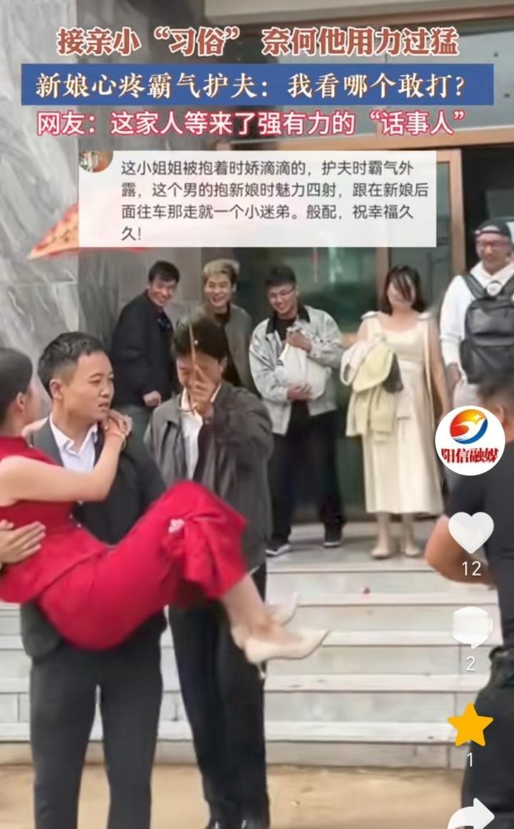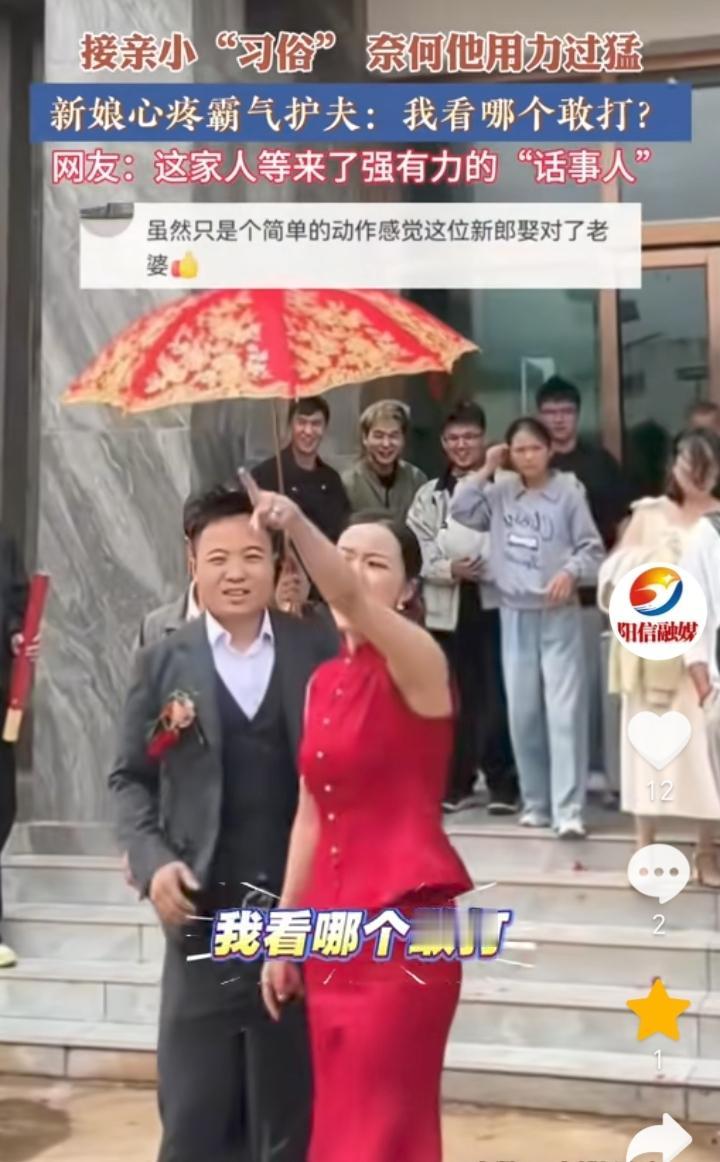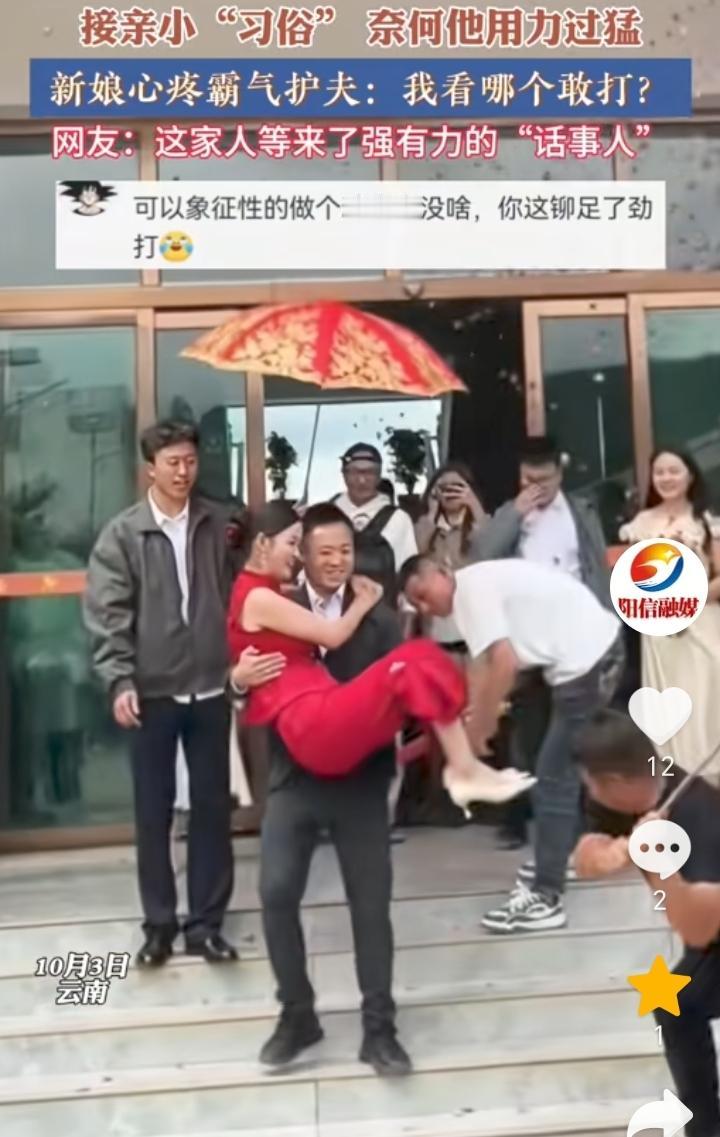 霸气护夫!云南,接亲现场新郎抱着新娘出来,因为有“习俗”要用树枝打新郎腿,结果用力过猛,新娘霸气护夫。 据阳信融媒报道,10月3日云南一对新人接亲因小“习俗”要用树枝打新郎腿,结果用力过猛原本一脸微笑的新郎面色都突然一变,可见真是打疼了,新娘发现后立马从新郎怀里跳下来,霸气护夫声称“我看那个敢打?”还一副“大姐大”的架势手指四周,紧接着好像是要找东西还回去的架势,新郎一把拉住一块走向婚车,新娘大步走新郎小跑跟着。 从这一幕就可以看出以后家里谁才是当家人,女子也是霸气护着丈夫,可能她觉得自己丈夫只能自己欺负,别人不能欺负。 有时候女方太强势就会显得男的有些懦弱,在外面还是尽量多给男的面子,因为男的一般都比较好面子。 打人的也是,也就象征的打下就可以了,用力那么大,也是没有分寸,新娘这一下护的可能打人者也会非常尴尬。 每个地方结婚可能都有不一样的习俗,这些习俗都表示着不同的含义,不过有时候也就是点到为止一定要注意分寸。