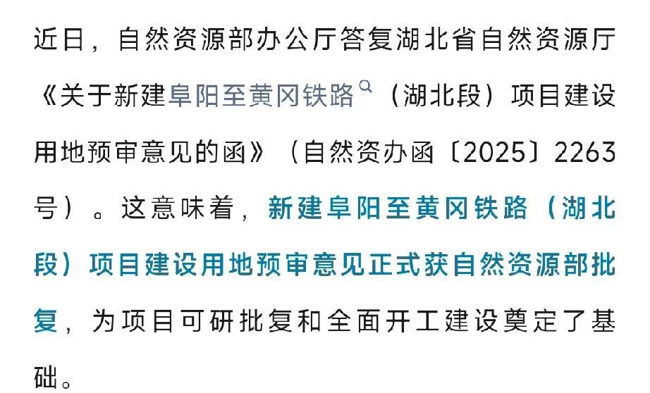 湖北省和安徽省的又一条重要高铁线路,阜阳至黄冈高铁有大推进 目前湖北和安徽两省合作,建设的最大的高铁项目,就是时速350公里/小时的合武高铁,预计2028年通车,比现有时速250公交/小时的合武动车速度更快,能让湖北省城市,特别是武汉市到达合肥,南京,苏州,上海等市时间更短。 综合湖北省,安徽省两省官方媒体消息,安徽阜阳至湖北黄冈铁路(湖北段),建设用地预审获得自然资源部批复,为项目全面开工建设奠定了基础。 阜阳至黄冈铁路的建设,除了可以加密鄂皖两省交通网络,同时对于阜阳市意义重大,在阜南县设站,阜阳可实现县县通高铁。#京九线黄冈段# #阜阳至黄冈段# #阜黄高铁# #合武高铁#