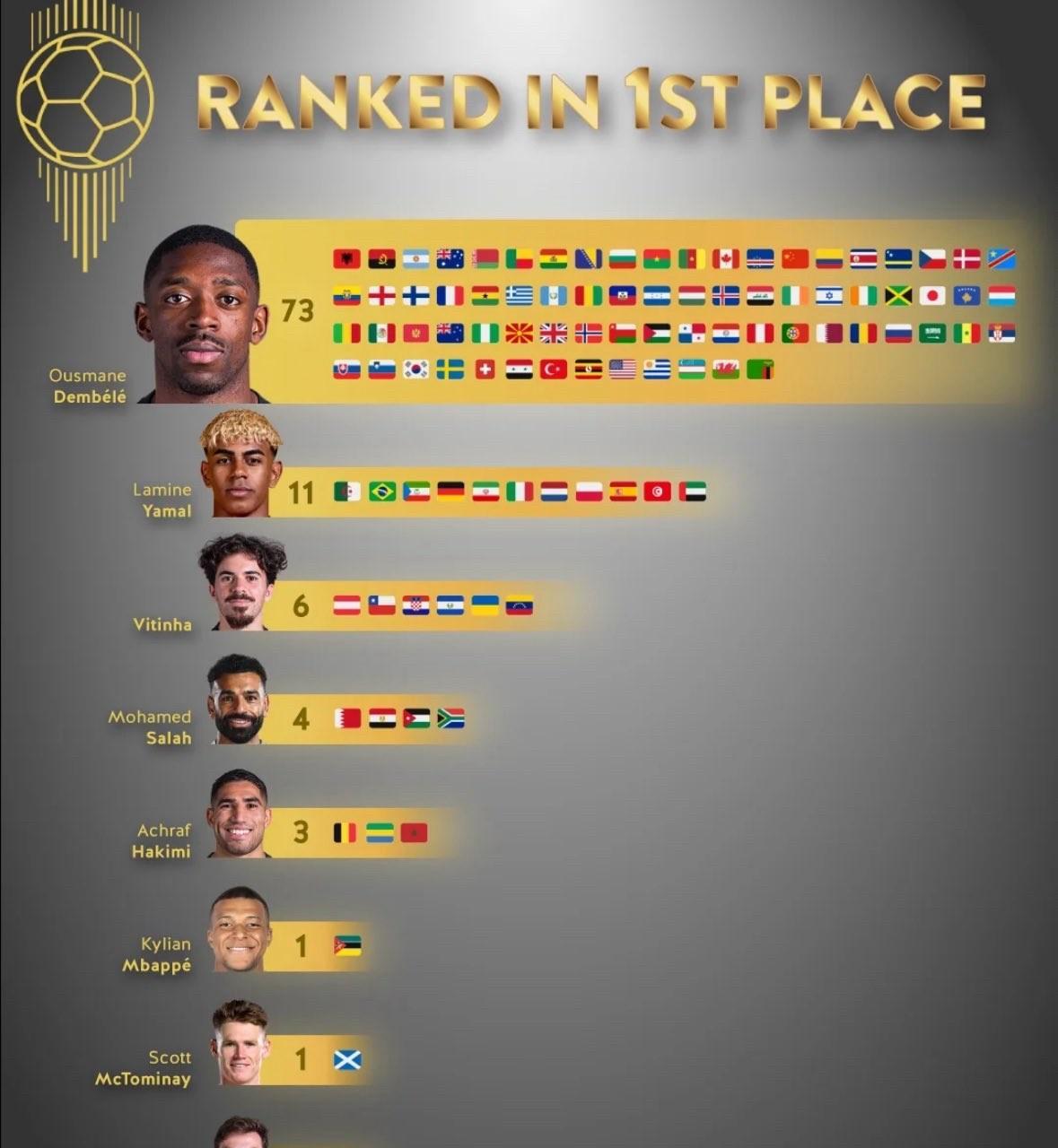 本届金球奖的评选中姆巴佩只获得了1个国家的记者投票 全球来自100个国家的100名记者对本届金球奖发起了投票选出本届金球奖的得主。登贝莱获得了来自100个国家记者中的73个记者的投票。作为赛季初呼声最高的姆巴佩只获得一票,而且这票来自莫桑比克。 而排名第二的登贝莱也才获得了11个记者投票,这也从侧面说明本届金球奖评选还算公平!