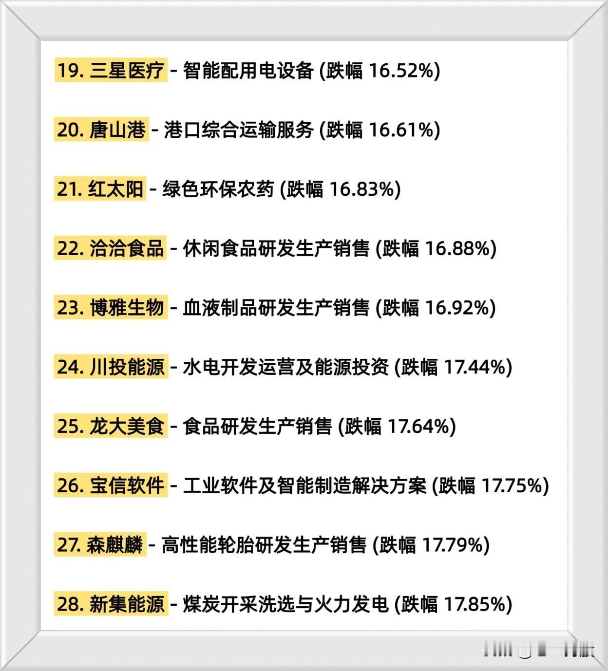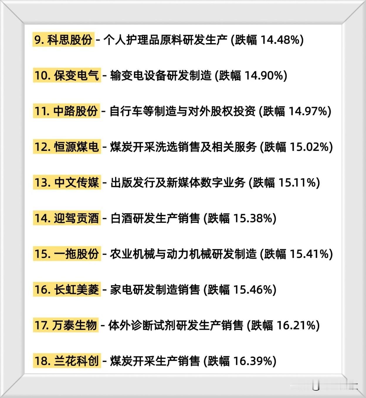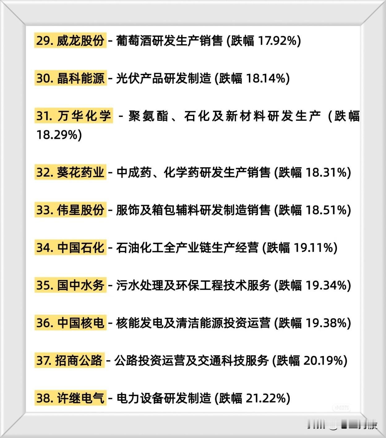“去年924至今未上涨的50只股票名单” 收藏研究! 1. 海兴电力 – 智能配用电及新能源产品系统(跌幅13.50%) 2. 仕净科技 – 工业污染治理及光伏设备制造(跌幅13.58%) 3. 山东出版 – 出版物编辑发行全产业链(跌幅13.63%) 4. 坤彩科技 – 无机颜料研发生产(跌幅13.79%) 5. 华星创业 – 移动通信技术服务及测试系统(跌幅14.20%) 6. 亚辉龙 – 体外诊断产品研发生产(跌幅14.25%) 7. 中信博 – 光伏支架系统研发生产销售(跌幅14.28%) 8. 万憬能源 – 城市燃气供应及设施安装服务(跌幅14.33%) 9. 科思股份 – 个人护理品原料研发生产(跌幅14.48%) 10. 保变电气 – 输变电设备研发制造(跌幅14.90%) 11. 中路股份 – 自行车等制造与对外股权投资(跌幅14.97%) 12. 恒源煤电 – 煤炭开采洗选销售及相关服务(跌幅15.02%) 13. 中文传媒 – 出版发行及新媒体数字业务(跌幅15.11%) 14. 迎驾贡酒 – 白酒研发生产销售(跌幅15.38%) 15. 一拖股份 – 农业机械与动力机械研发制造(跌幅15.41%) 16. 长虹美菱 – 家电研发制造销售(跌幅15.46%) 17. 万泰生物 – 体外诊断试剂研发生产销售(跌幅16.21%) 18. 兰花科创 – 煤炭开采生产销售(跌幅16.39%) 19. 三星医疗 – 智能配用电设备(跌幅16.52%) 20. 唐山港 – 港口综合运输服务(跌幅16.61%) 21. 红太阳 – 绿色环保农药(跌幅16.83%) 22. 洽洽食品 – 休闲食品研发生产销售(跌幅16.88%) 23. 博雅生物 – 血液制品研发生产销售(跌幅16.92%) 24. 川投能源 – 水电开发运营及能源投资(跌幅17.44%) 25. 龙大美食 – 食品研发生产销售(跌幅17.64%) 26. 宝信软件 – 工业软件及智能制造解决方案(跌幅17.75%) 27. 森麒麟 – 高性能轮胎研发生产销售(跌幅17.79%) 28. 新集能源 – 煤炭开采洗选与火力发电(跌幅17.85%) 29. 威龙股份 – 葡萄酒研发生产销售(跌幅17.92%) 30. 晶科能源 – 光伏产品研发制造(跌幅18.14%) 31. 万华化学 – 聚氨酯、石化及新材料研发生产(跌幅18.29%) 32. 葵花药业 – 中成药、化学药研发生产销售(跌幅18.31%) 33. 伟星股份 – 服饰及箱包辅料研发制造销售(跌幅18.51%) 34. 中国石化 – 石油化工全产业链生产经营(跌幅19.11%) 35. 国中水务 – 污水处理及环保工程技术服务(跌幅19.34%) 36. 中国核电 – 核能发电及清洁能源投资运营(跌幅19.38%) 37. 招商公路 – 公路投资运营及交通科技服务(跌幅20.19%) 38. 许继电气 – 电力设备研发制造(跌幅21.23%)