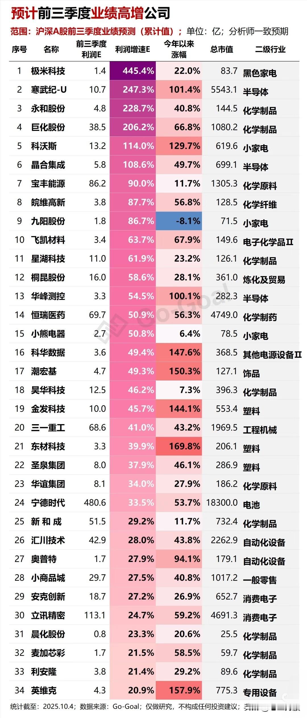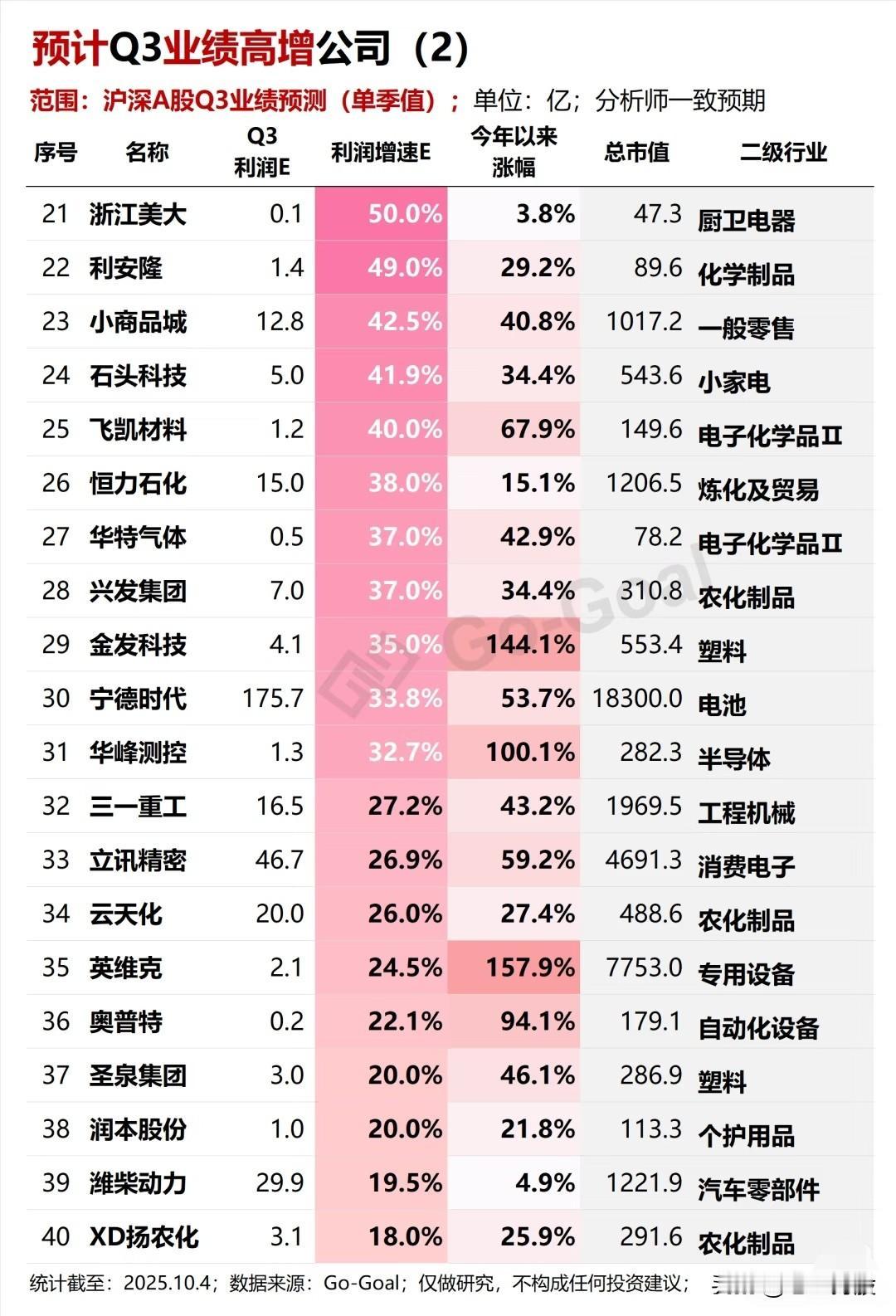 沪深A股2025年第三季度及前三季度业绩高增公司的综合总结(数据截至2025年10月4日,仅供研究参考,不构成投资建议): 一、预计Q3单季业绩高增公司(共40家,分两张表展示) 表1(序号1-20)亮点公司包括: - 科沃斯:Q3预计利润3.4亿元,同比增速高达5478.1%,今年以来股价已上涨129.7%,总市值约619.6亿元,属于小家电行业。 - 桐昆股份:Q3利润5.0亿元,增速954.0%,今年以来涨幅28.1%,总市值361.0亿元,炼化及贸易行业。 - 科华数据:Q3利润1.1亿元,增速800.9%,今年以来涨幅147.6%,总市值368.5亿元,其他电源设备行业。 - 巨化股份:Q3利润18.0亿元,增速325.0%,今年以来涨66.8%,总市值1080.2亿元,化学制品行业。 - 传音控股:Q3利润25.7亿元,增速144.7%,总市值1074.2亿元,消费电子行业。 - 恒瑞医药:Q3利润25.2亿元,增速112.1%,今年以来涨56.3%,总市值近4749亿元,化学制药龙头。 - 宁德时代:Q3利润175.7亿元,增速33.8%,总市值高达18300亿元,电池行业巨头。 其他如小熊电器、极米科技、九阳股份、晶合集成、宝丰能源、华谊集团、中国石化等也均录得较高的单季利润增速,分布在家用电器、半导体、化工、机械、能源等多个行业。 表2(序号21-40)部分亮点: - 浙江美大:Q3利润0.1亿元,增速50.0%,总市值47.3亿元,厨卫电器。 - 石头科技:Q3利润5.0亿元,增速41.9%,总市值543.6亿元,小家电。 - 宁德时代虽在表1也有出现,表2中再次凸显其行业地位。 - 三一重工:Q3利润16.5亿元,增速27.2%,总市值1969.5亿元,工程机械。 - 立讯精密:Q3利润46.7亿元,增速26.9%,总市值4691.3亿元,消费电子。 - 华峰测控、芯原股份、东材科技、润本股份、英维克等公司也展现出较强的单季度成长性,涉及半导体、电子化学品、塑料、个护、专用设备等领域。 二、预计前三季度累计业绩高增公司(共34家) 该组数据为2025年前三季度(1-9月)累计利润及增速,同样基于分析师一致预期: 亮点公司包括: - 极米科技:前三季度利润1.4亿元,增速高达445.4%,今年以来股价上涨22.0%,总市值83.7亿元,黑色家电。 - 寒武纪-U:前三季度利润10.7亿元,增速247.3%,今年以来涨幅101.4%,总市值5543.1亿元,半导体行业。 - 永和股份、巨化股份、科沃斯:前三季度利润增速分别为228.7%、206.2%、114.0%,均属于化工或家电行业,增长显著。 - 宁德时代:前三季度利润480.6亿元,增速33.5%,总市值18300亿元,继续展现电池行业龙头地位。 - 恒瑞医药:前三季度利润69.7亿元,增速50.9%,总市值近4749亿元。 - 三一重工、立讯精密、华峰测控、宝丰能源、东材科技、新和成、汇川技术、英维克等公司也均实现前三季度利润较高增长,覆盖工程机械、消费电子、半导体、化工、自动化设备等多个领域。 总体特征与行业分布 1. 高增长行业集中: - 科技与制造:包括半导体(如寒武纪-U、晶合集成、华峰测控、芯原股份)、消费电子(立讯精密、传音控股、安克创新)、电池(宁德时代)等行业增速突出。 - 化工与材料:如巨化股份、永和股份、桐昆股份、东材科技、皖维高新、利安隆等,多个公司利润翻倍以上增长。 - 家电:科沃斯、小熊电器、九阳股份、石头科技等,部分企业利润增速超100%-5000%。 - 传统与能源:包括三一重工、中国石化、恒力石化等,也有不错增长表现。 - 医药:恒瑞医药、新和成等化学制药与原料药企业利润增长稳健或加速。 2. 增速特征: - 多家公司Q3单季利润同比增长超过100%,甚至达到数千百分点(如科沃斯5478.1%),显示出极强的盈利弹性或基数效应。 - 前三季度累计利润增速亦普遍较高,部分公司利润绝对值已达数十亿乃至百亿级别(如宁德时代、恒瑞医药、中国石化)。 3. 市值分布广泛: - 既有总市值数千亿的行业巨头(如宁德时代、恒瑞医药、中国石化、立讯精密),也有几十亿到百亿的中型成长型企业。