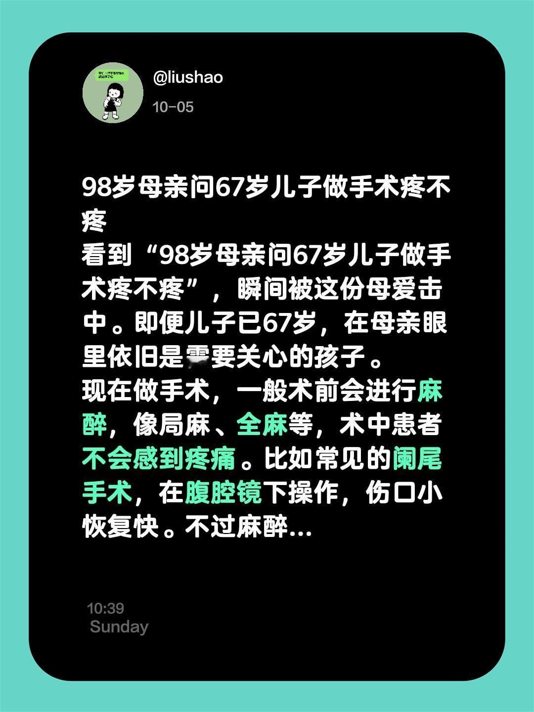 98岁母亲问67岁儿子做手术疼不疼 看到“98岁母亲问67岁儿子做手术疼不疼”,瞬间被这份母爱击中。即便儿子已67岁,在母亲眼里依旧是需要关心的孩子。 现在做手术,一般术前会进行麻醉,像局麻、全麻等,术中患者不会感到疼痛。比如常见的阑尾手术,在腹腔镜下操作,伤口小恢复快。不过麻醉药效过了,术后多数人刀口会有轻微疼痛,通常能自行忍受,疼得厉害医生也会开止痛药。 这简单的一问,藏着母亲跨越年龄的牵挂,无论孩子多大,在母亲心里永远是软肋。