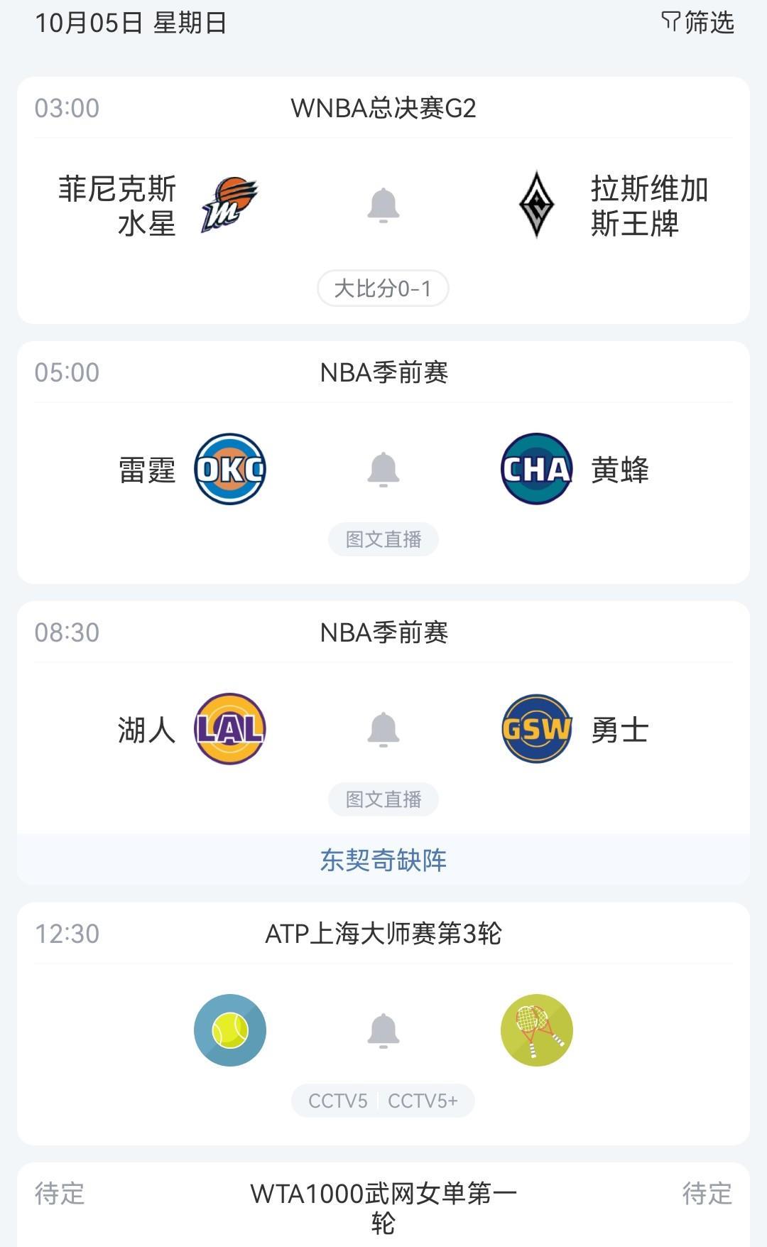 明日湖人战勇士雷霆战黄蜂WNBA总决赛G2水星战王牌等焦点赛事关注