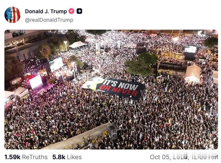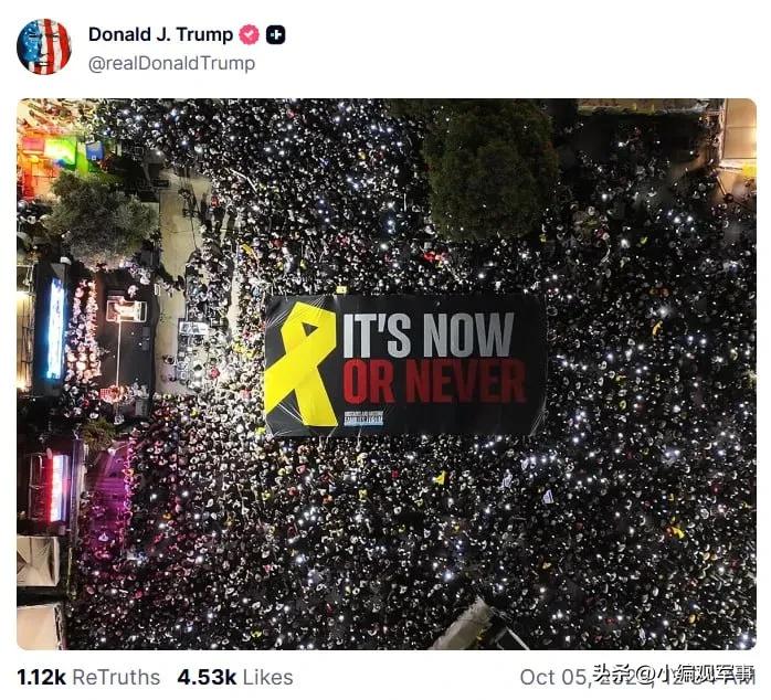 🇺🇸🇮🇱⚡️ — 美国总统特朗普发布了特拉维夫市的以色列抗议者要求释放以色列人质的照片。 以色列出而反而