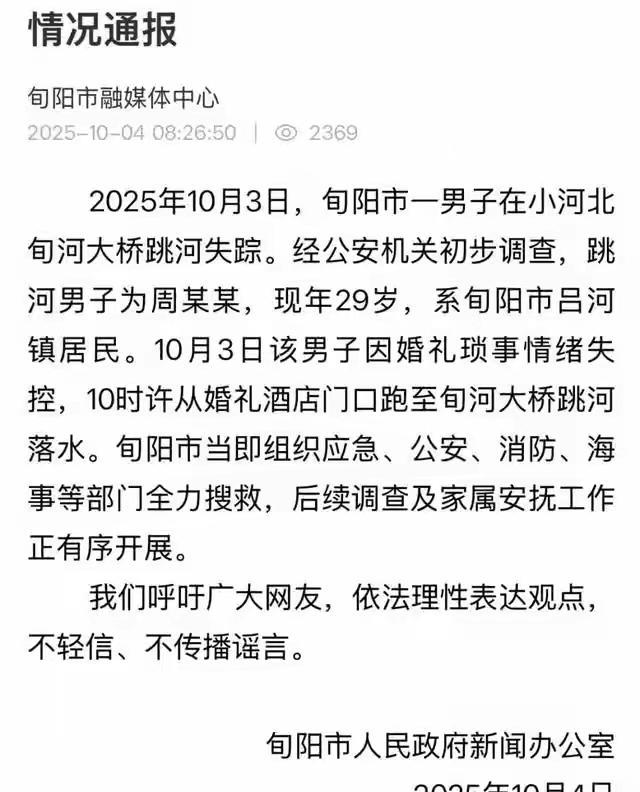 新郎婚礼当天跳河,当地官方又辟谣了 10月5日,陕西旬阳市融媒体中心发布消息:见