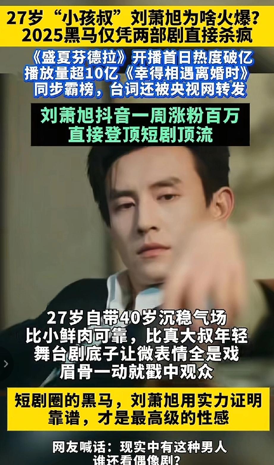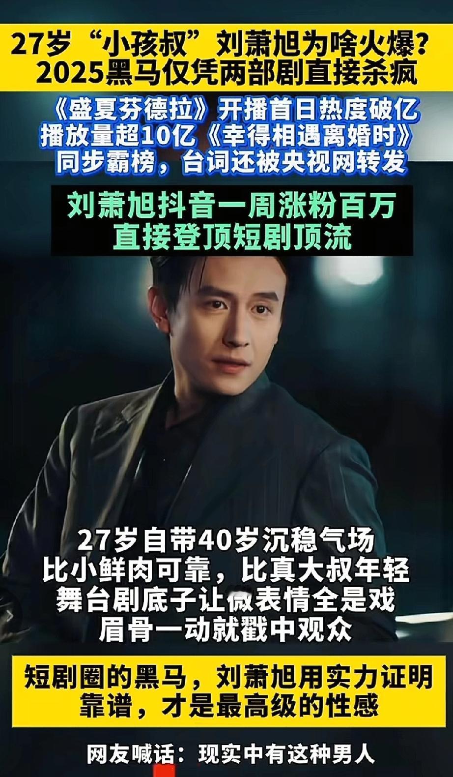 两部剧播放量破10亿,抖音一周涨粉百万!刘萧旭凭什么成2025短剧黑马? 2025年的短剧江湖,杀出了一匹最大的黑马——刘萧旭。 这个年仅27岁的演员,用两部剧就直接改写了短剧顶流的格局: - 《盛夏芬德拉》开播首日热度秒破亿 - 《幸得相遇离婚时》播放量轻松飙过10亿 更惊人的是,他在抖音上一周就狂揽百万粉丝,直接登顶。 网友们更是集体"上头",纷纷喊话:"现实中有这种男人,谁还看偶像剧?" 那么,这个横空出世的"小孩叔",到底凭什么能火得这么不讲道理? 在这个小鲜肉扎堆的时代,刘萧旭走出了一条差异化路线。他身上有一种奇妙的反差感:27岁的脸庞,却自带40岁的沉稳气场。 这种独特的"叔感"让他精准卡位:比小鲜肉多了份成熟可靠,比真大叔多了份少年活力。他填补了市场空白,成了无数观众心中的“理想型”男神。 都说好看的皮囊千篇一律,扎实的演技才是硬道理。刘萧旭有七年话剧舞台经验,这是他的底气。 在短剧中,他的表演极具感染力:一个眼神的变化,一次眉骨的轻挑, 一个细微的表情,这些都精准传递出角色的复杂情绪,让观众一秒入戏。他用实力证明,好演技才是行走江湖的最佳通行证。 话说屏幕前的你,喜欢他这份没有明星架子的松弛感吗?欢迎来评论区里一起来聊聊! 你最推荐的一个剧刘萧旭 短剧