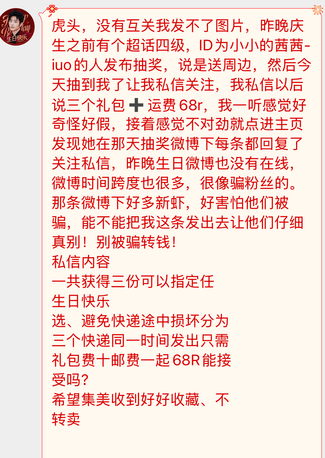 肖战粉丝警惕以肖战生日抽奖为由,索要高额邮费的假粉丝!!